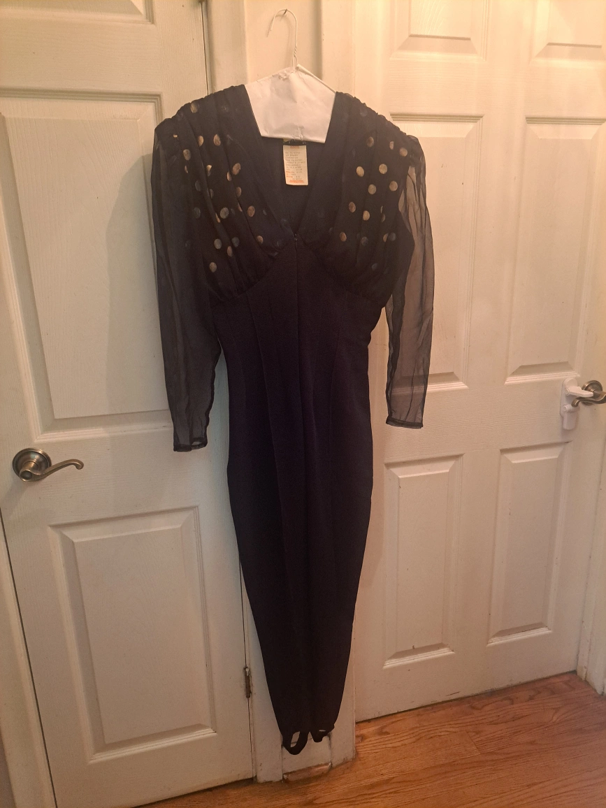 Black and Gold Vintage Jumpsuit with gold polka dot sheer sleeves size 10. Excellent condition. Pick up in Scarborough at Markham and Lawrence Ave E
