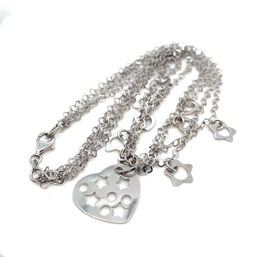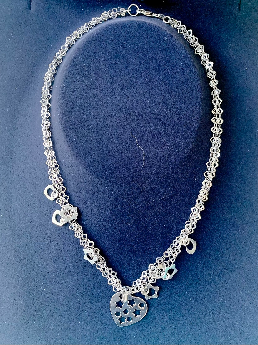 Gorgeous funky one necklace but has 4 chains attached to it and 9 pendants in total. The necklace is made of Sterling Silver marked 925 made with various charms including stars and hearts.