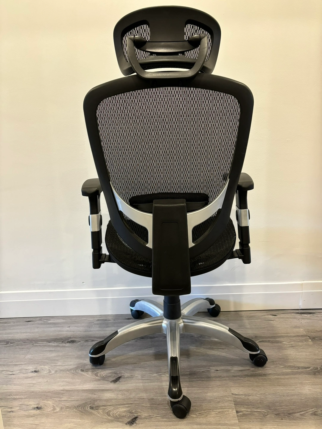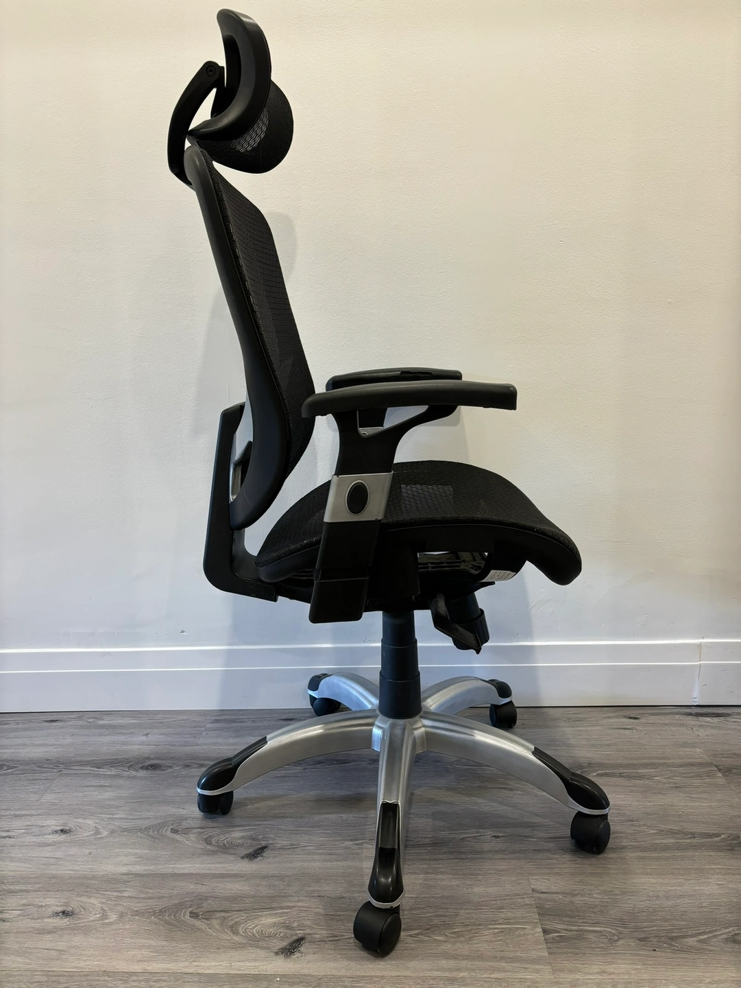 Mesh office chair with a headrest. It features adjustable armrests and a swivel base.