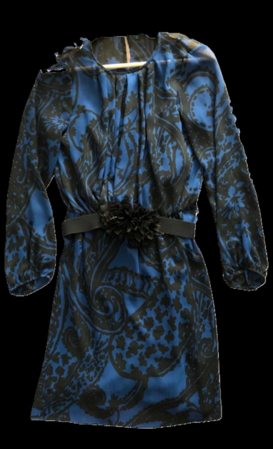 Long-sleeved dress with a black belt and black floral accents. The dress is made of a soft material and is very comfortable to wear. It is perfect for a casual day out or a special occasion.