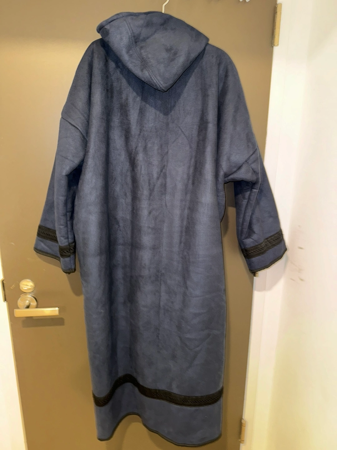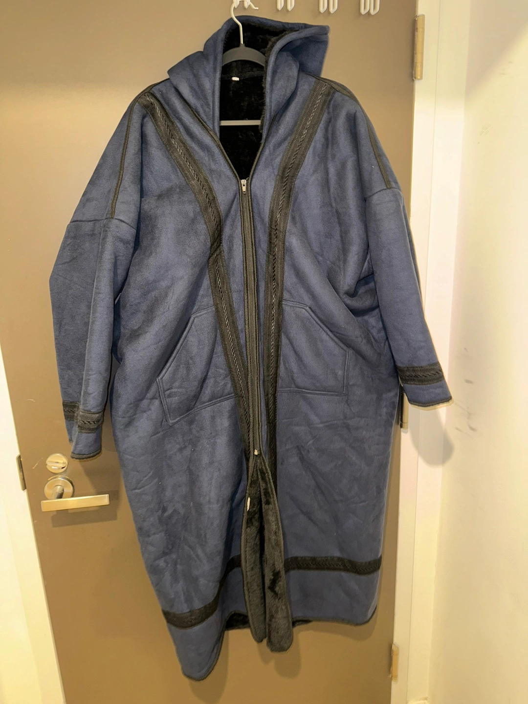 Long hooded jacket with zipper closure and pockets. It’s lined with soft fur inside, and it's custom-made by a skilled tailor. The fur adds an extra layer of coziness, making it perfect for those chilly days. It's both stylish and practical. If your interested leave me a message.