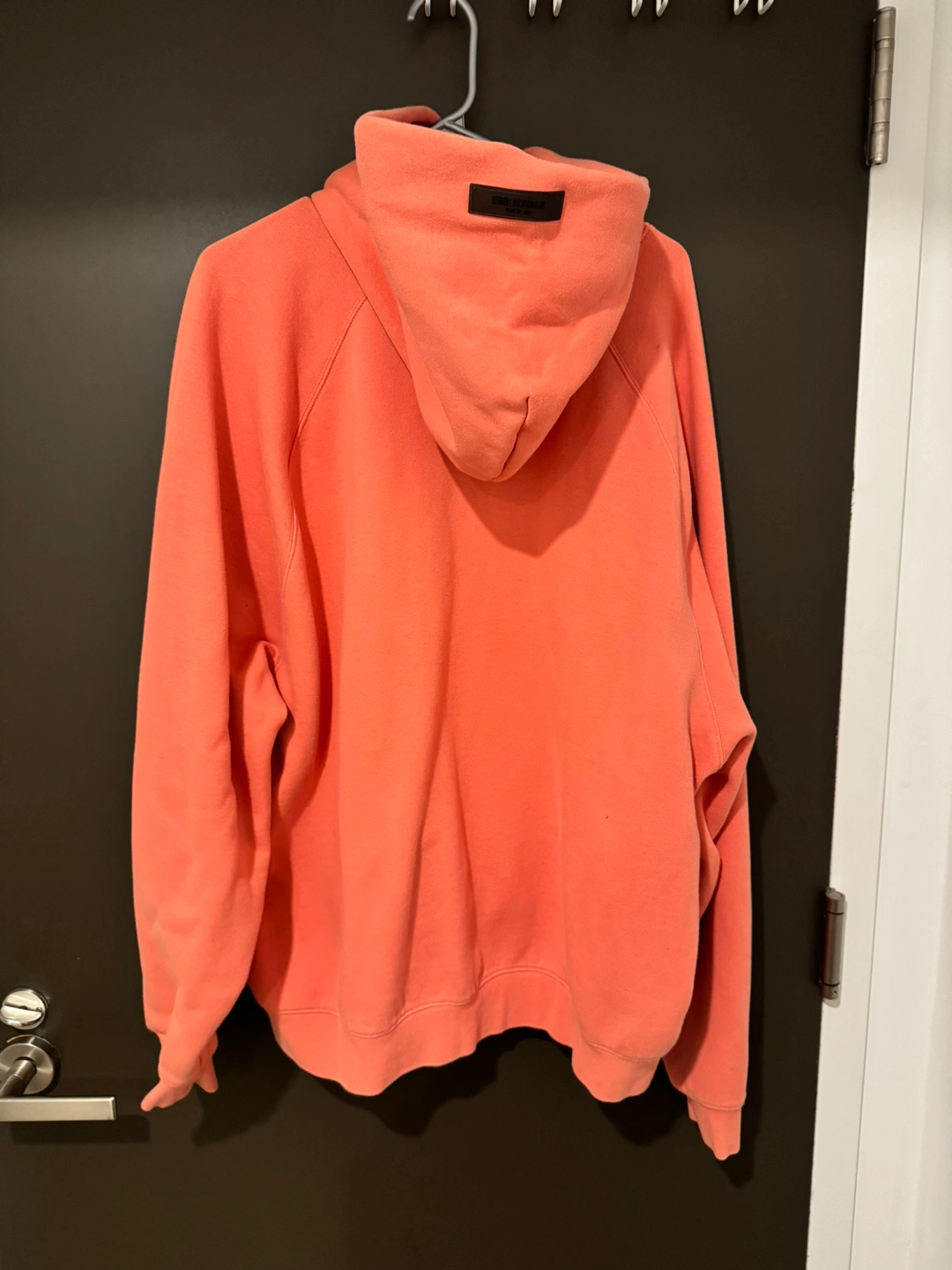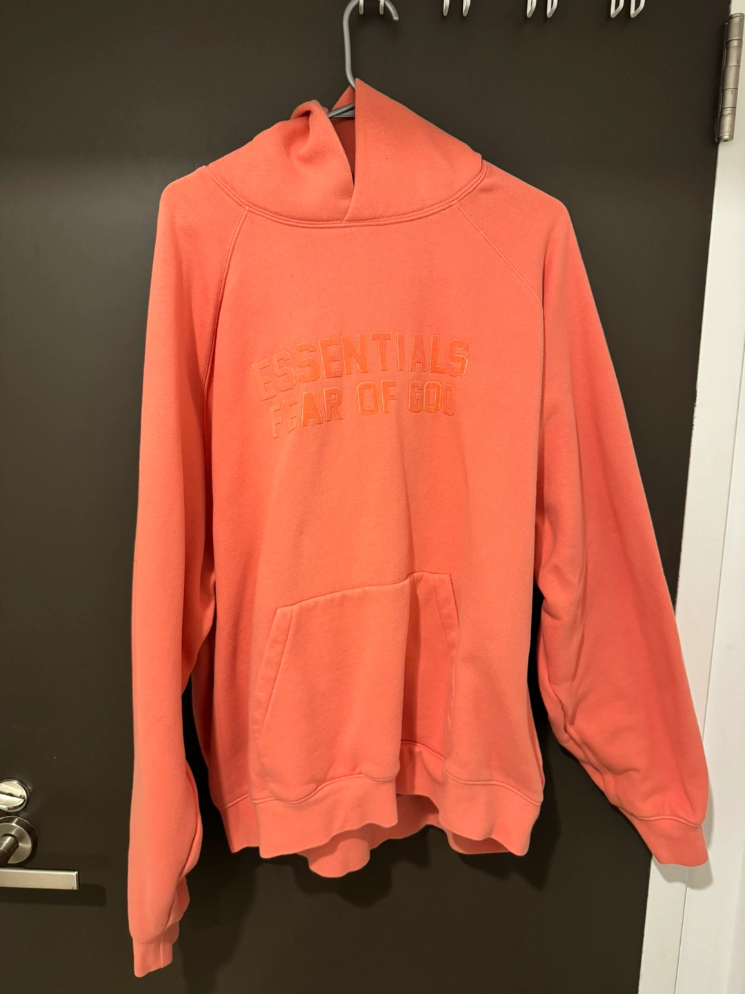 A Fear of God Essentials hoodie in a pink colour. This is a slightly used hoodie. I dont really wear bright colors especially pink so havent gotten my hands on them as much. Condition is good. If your interesed please leave a message.