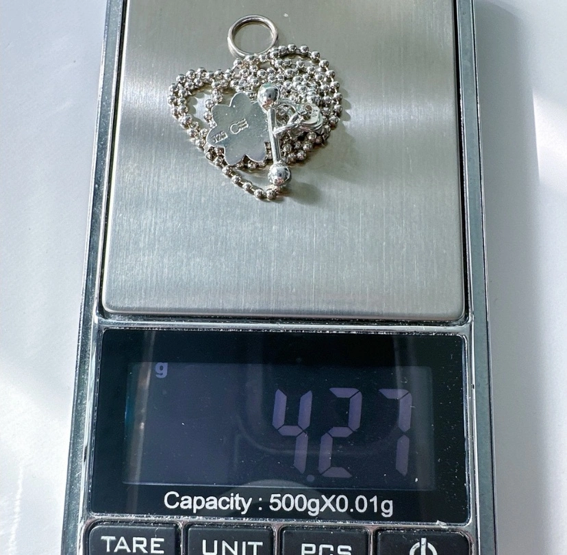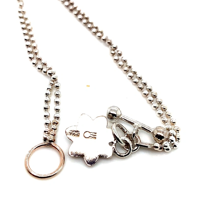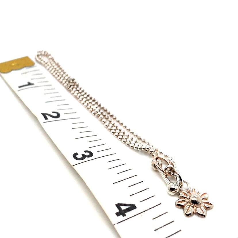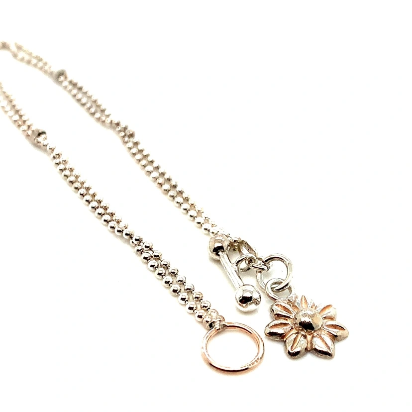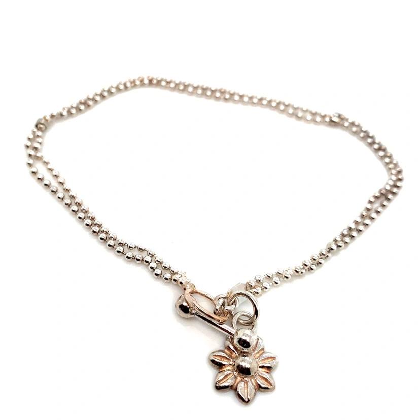 A Sterling silver toggle style bracelet with a small daisy charm. The chain is approximately 8 inches long and is marked 925