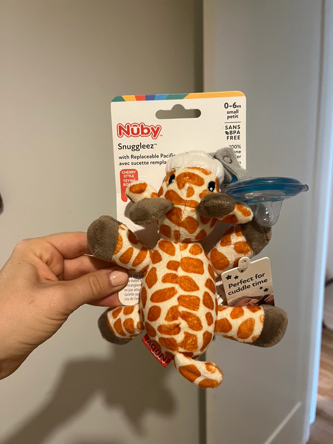 206This is a cute and cuddly giraffe toy with a pacifier. Brand new in packaging. The toy is made of soft, plush material and has a replaceable pacifier. 0-6 months.
