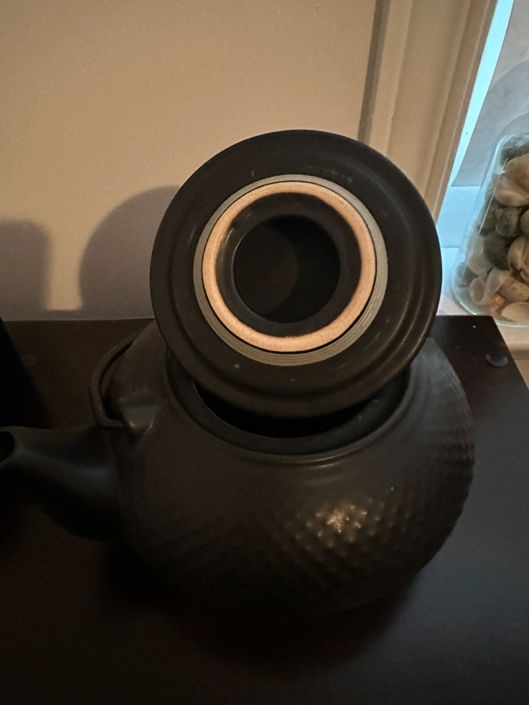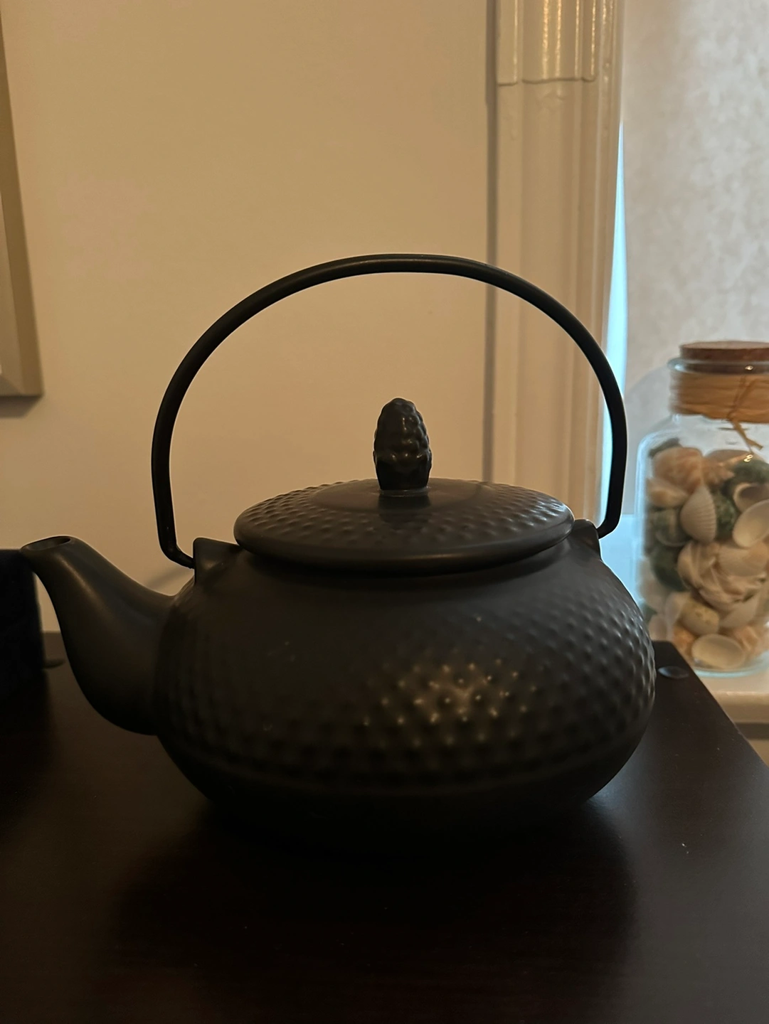 Black teapot. The teapot has a textured finish and comes with an infuser and lid. It is approximately 6 inches tall. Used a couple times, smoke free home