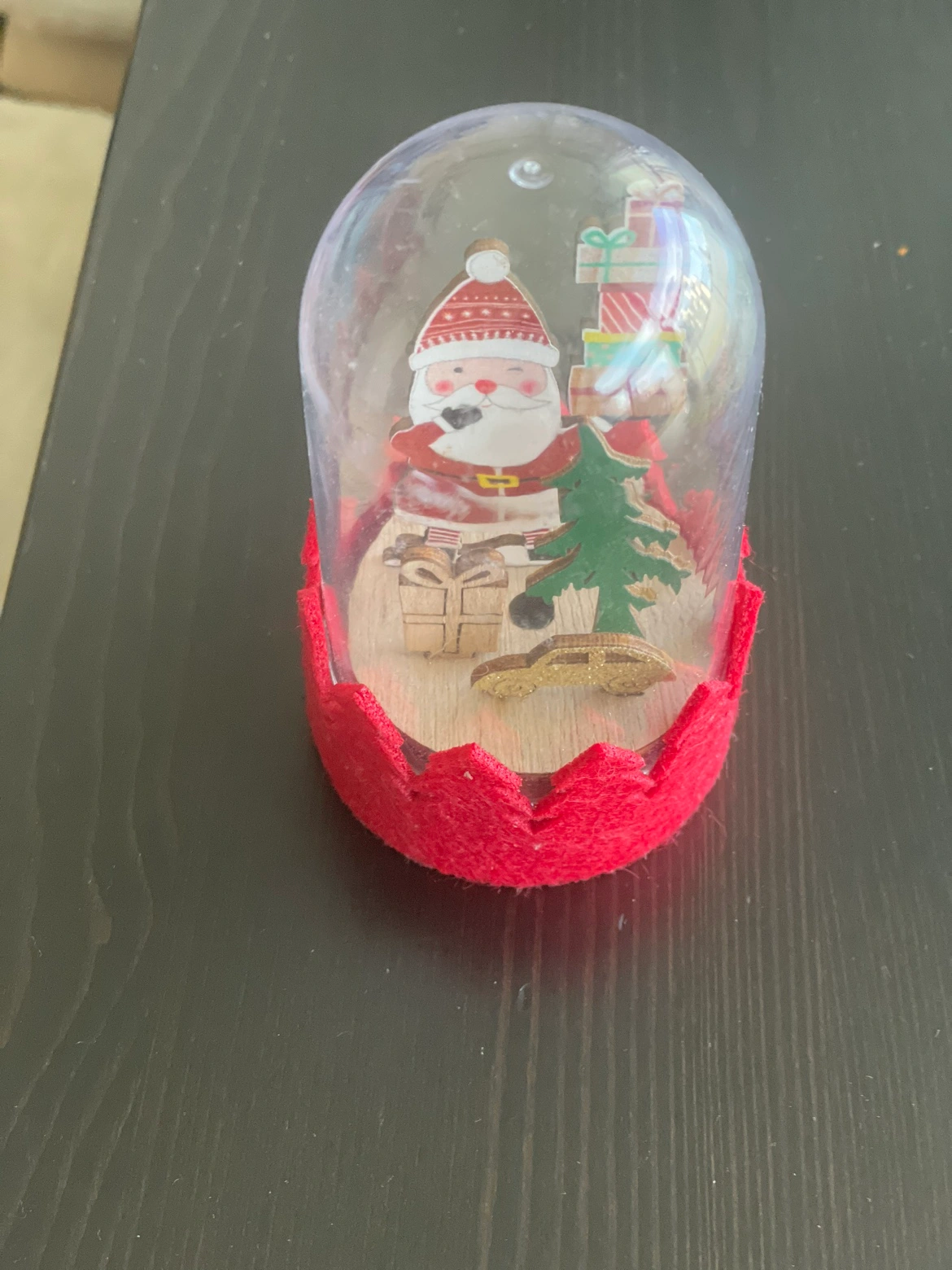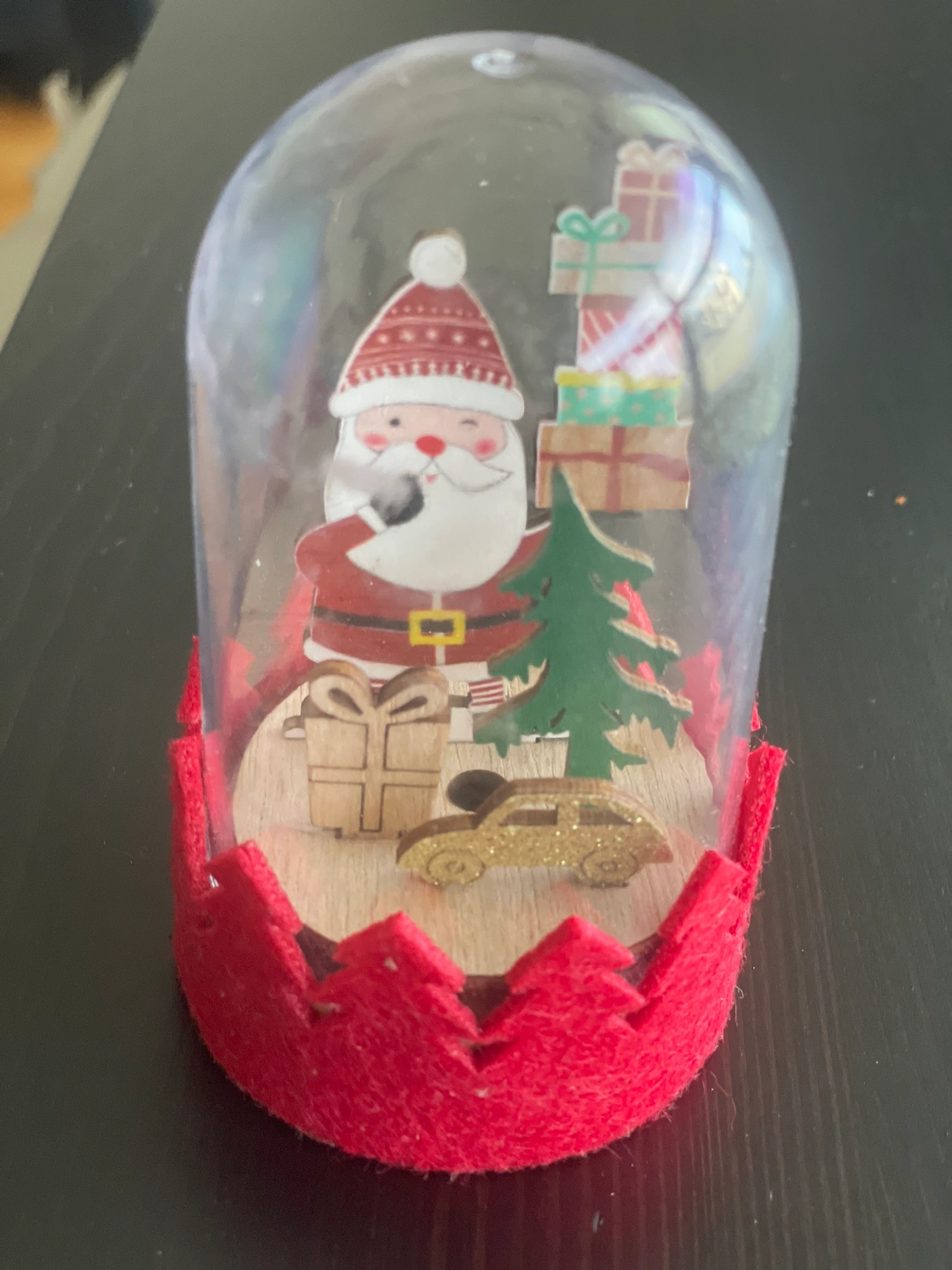 Small Santa Claus Christmas decoration with a tree and presents.