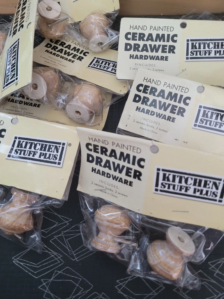 Set of 9 packs of ceramic drawer knobs, 2 per package. Includes screws.