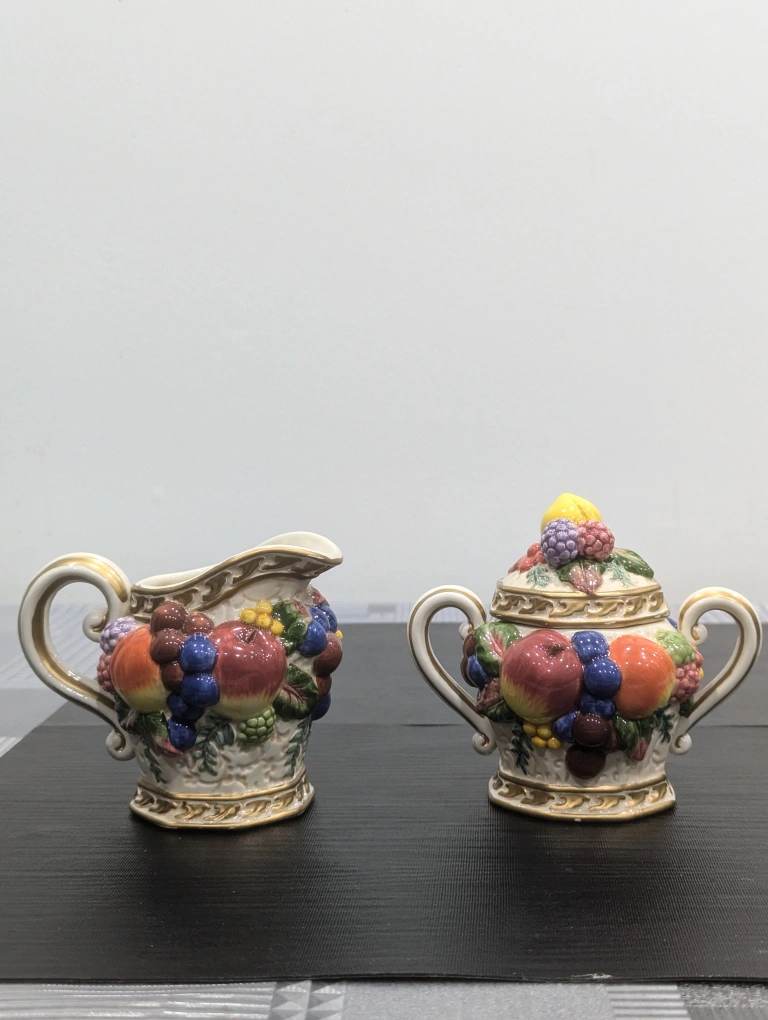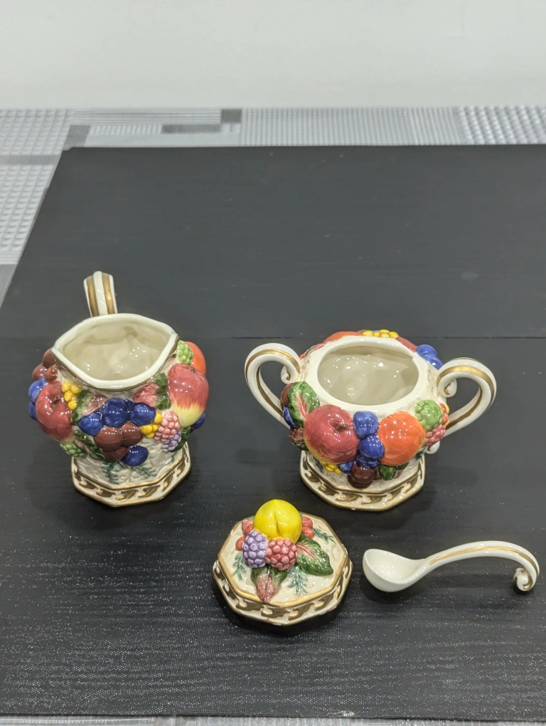Classic Fitz and Floyd Venezia Lidded Sugar Bowl and Creamer Set with Spoon . All in good condition. Measurements: Sugar bowl: 5.5" x 5.5" Creamer: 4.5" x 5"