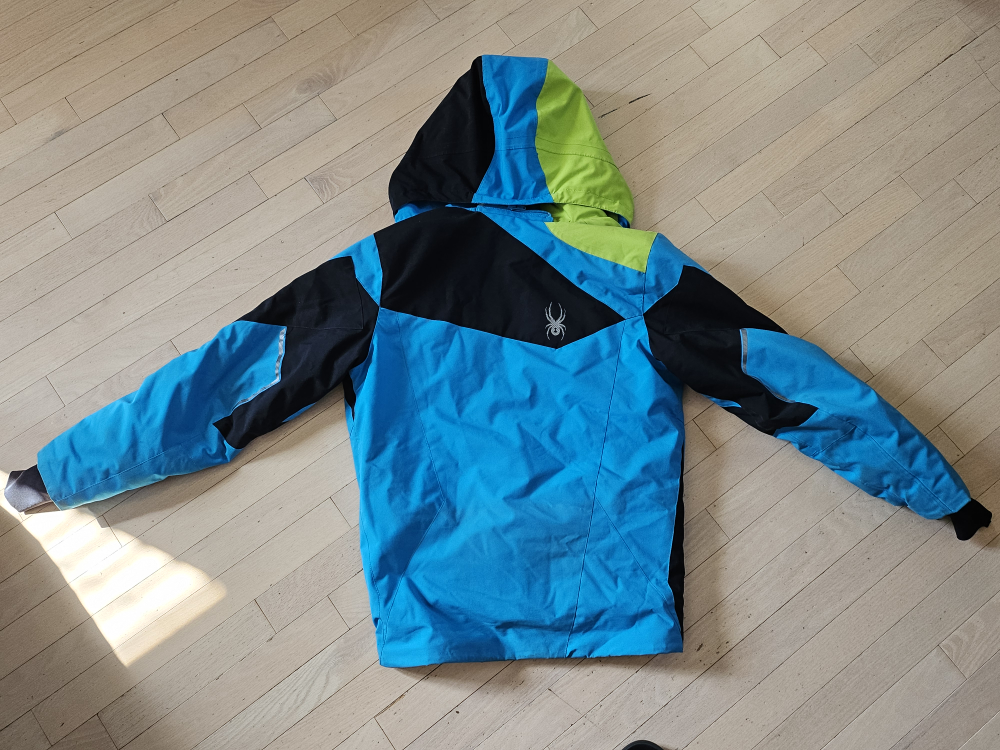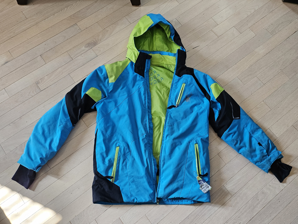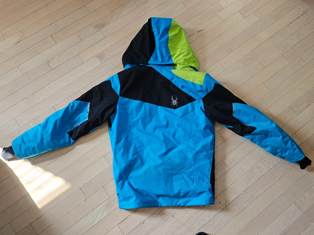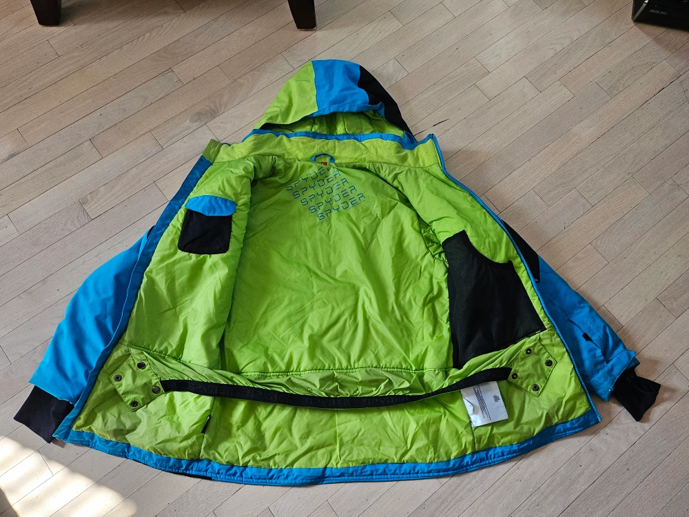 Spyder Brand Blue and Green ski jacket with a hood. Great light weight and warm runabout jacket for the winter. Uses superior Spyder technology for warmth.