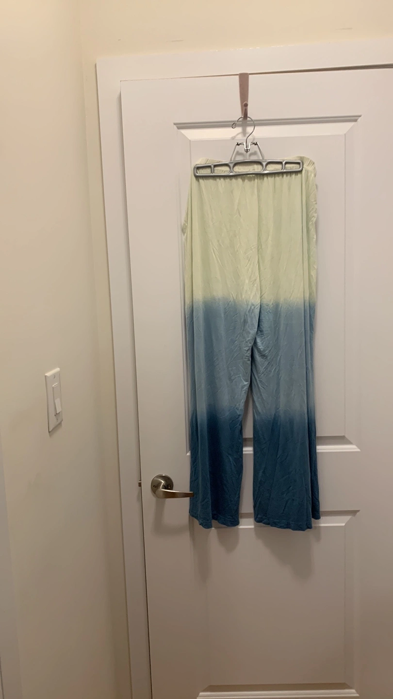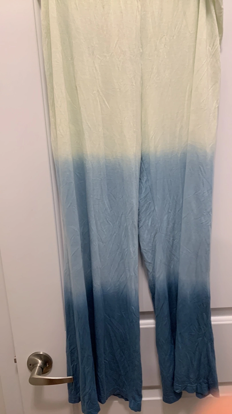 These pants are two shades of blue and white tie dye. They are a wide leg style and are very comfortable. It has an elastic waistband.