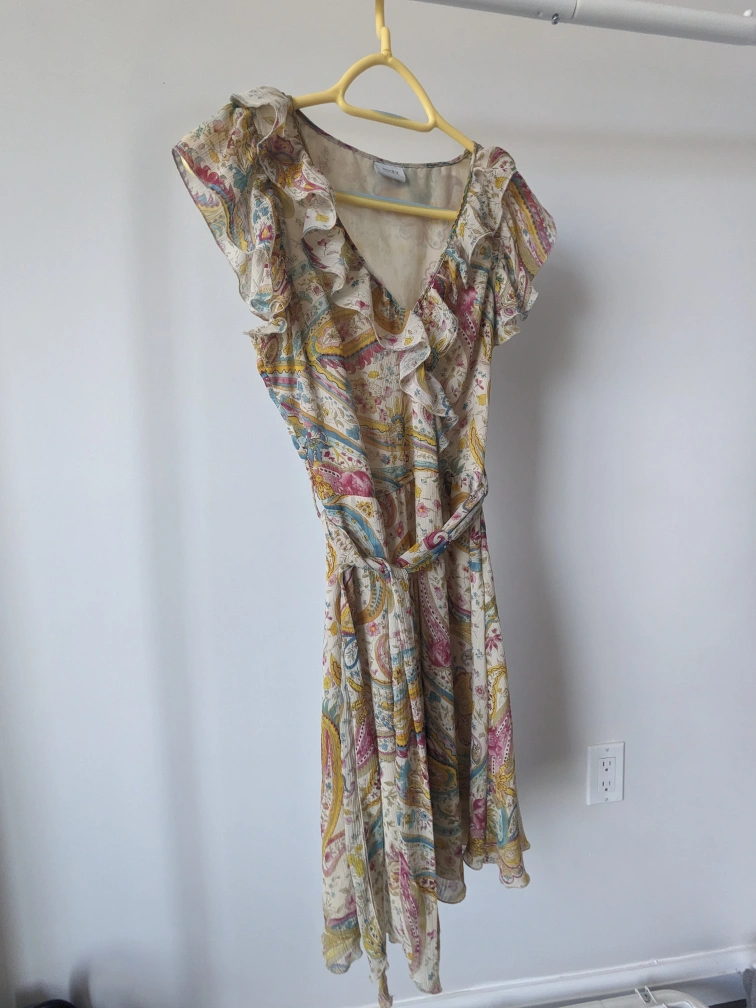A beautiful floral print dress with a ruffle detail around the neckline. This dress features a v-neck, cap sleeves, and a tie belt.