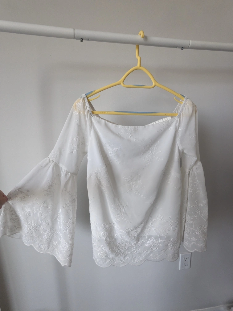 Off the shoulder white blouse with bell sleeves. It is embroidered with white flowers and has scalloped edges.