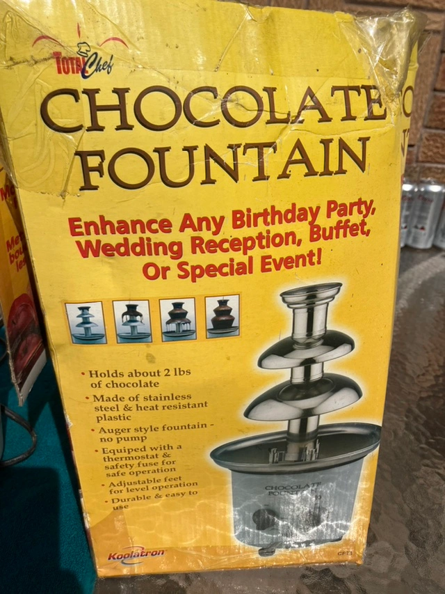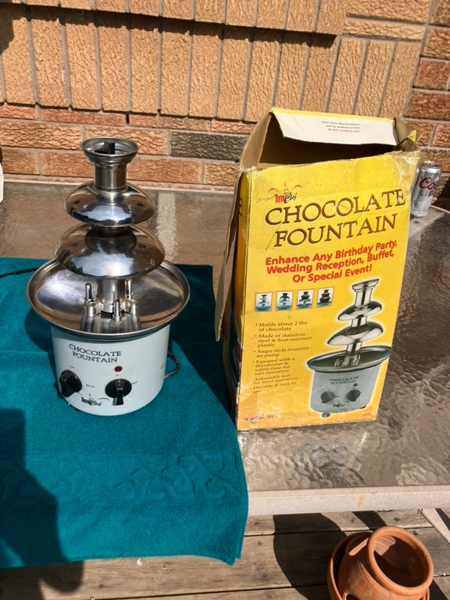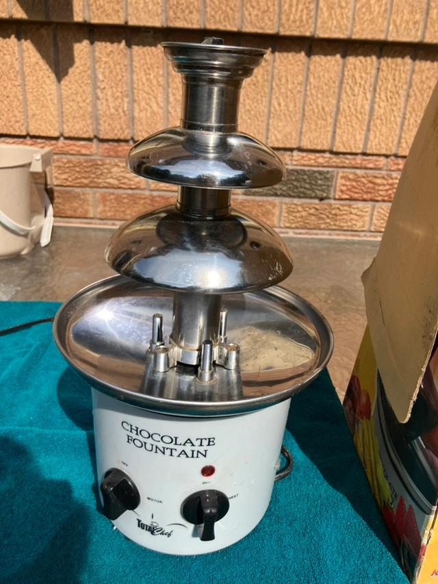 This is a four tier chocolate fountain. It is in good condition, with no cracks or breaks. It is ready for your next birthday, holiday event! with fruit, marshmallows! We’ve even used with meltable cheese for a fondue P/up in Thornhill, Yonge St south of Hwy 7/407