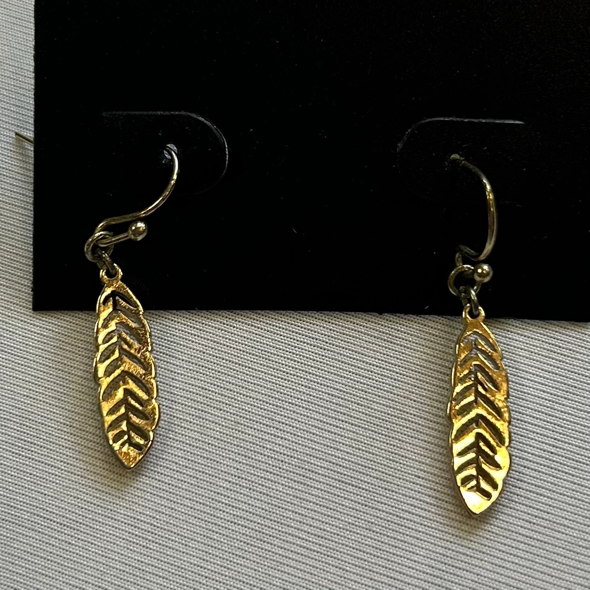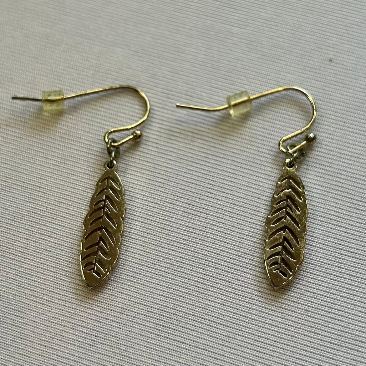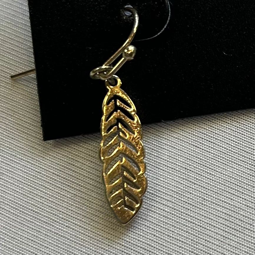 Exquisite gold-toned feather earrings from MyStyle, exuding a sense of elegance with their intricate details and textured finish. Each piece delicately dangles from a shepherd hook, offering gentle movement that catches the light beautifully. These earrings are perfect for adding a touch of sophistication to any ensemble. Worn only once. See photos for measurements. Cross posted.