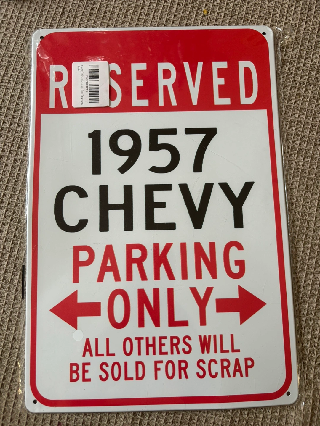 286This is a metal sign that reads "1957 Chevy Parking Only". It has a red border and a white background. The sign is approximately 12 inches by 18 inches. It is in good condition and would be a great addition to any garage or man cave.