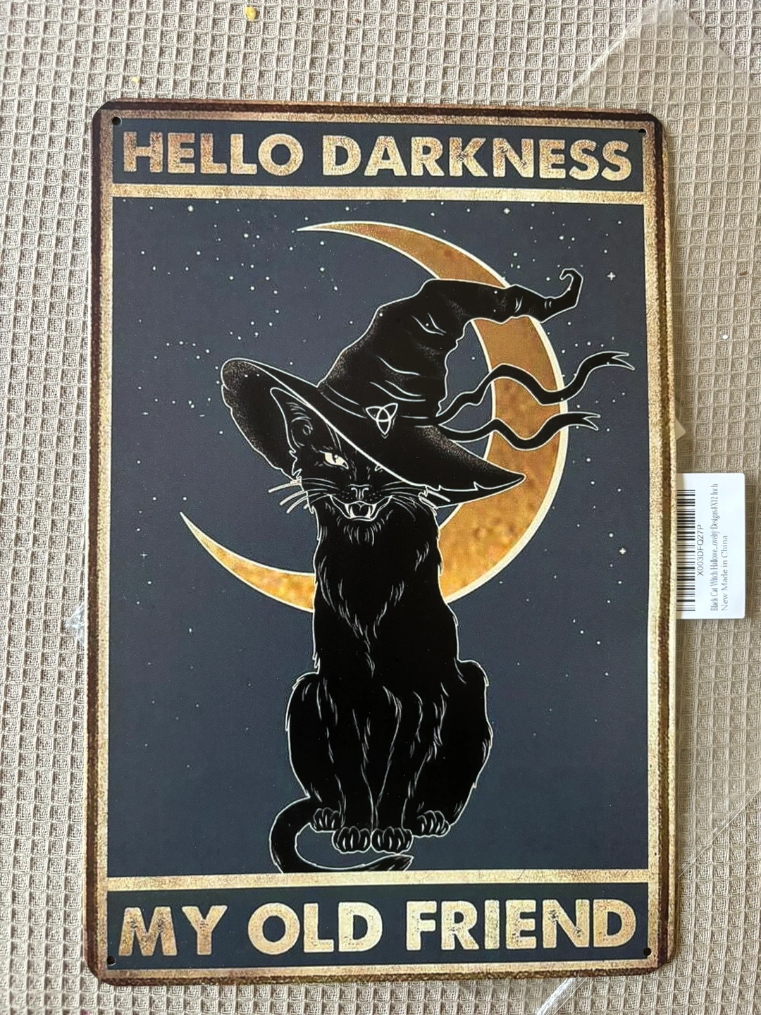 286This sign is a metal sign featuring a black cat wearing a witch's hat in front of a crescent moon. The sign reads "Hello Darkness My Old Friend".