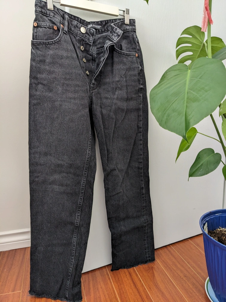 525Size 4, raw hem black straight leg crop jeans. Great pockets and stylish - goes well with any outfit. excellent condition, no stains or flaws. Meet up near knight and 49th, or we can plan something!