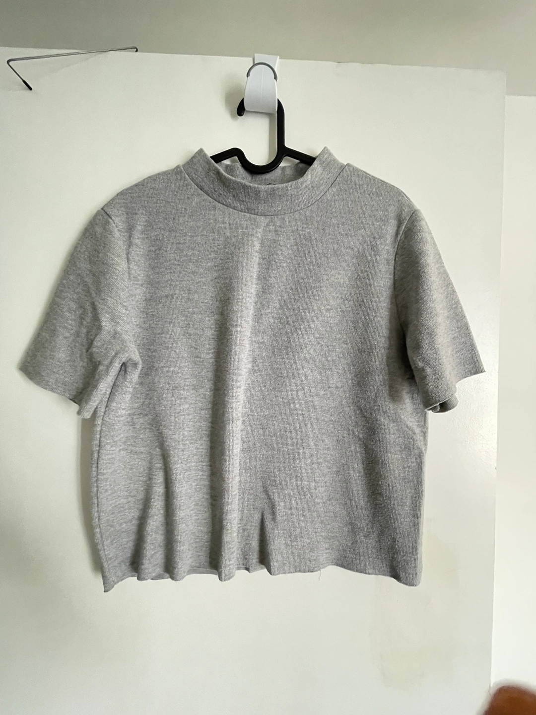 Grey ribbed crop top with short sleeves. It has a mock neck. Made of a soft stretchy material. It would be a great top for layering or wearing on its own.
