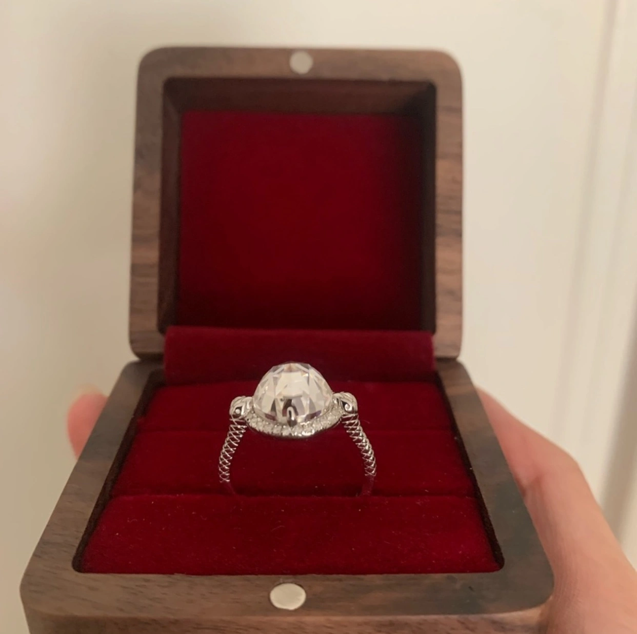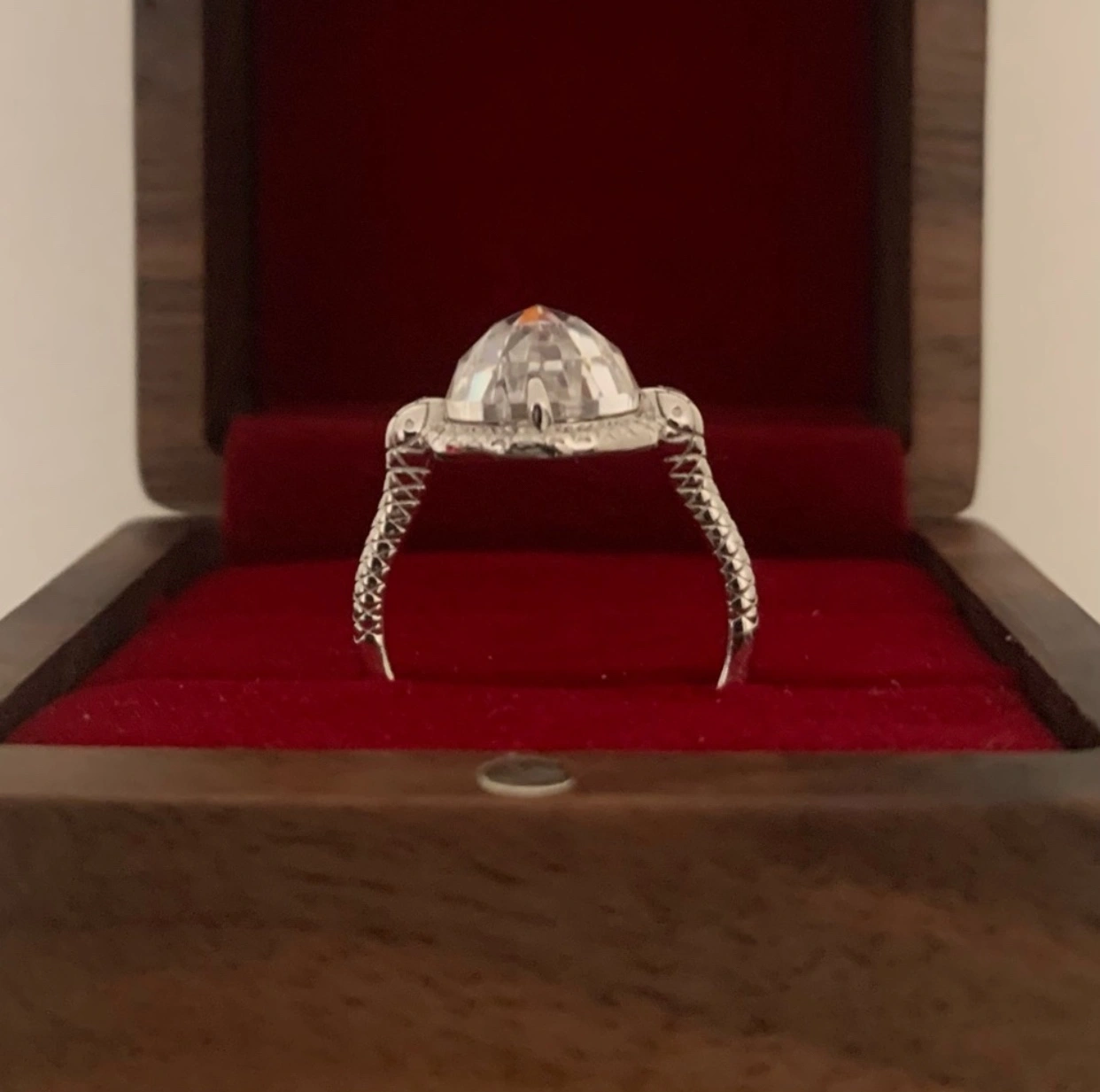 4 carat moissanite rose cut center stone with moissanite halo accent.