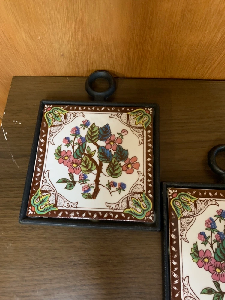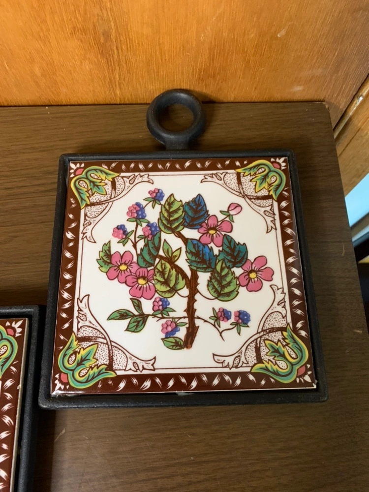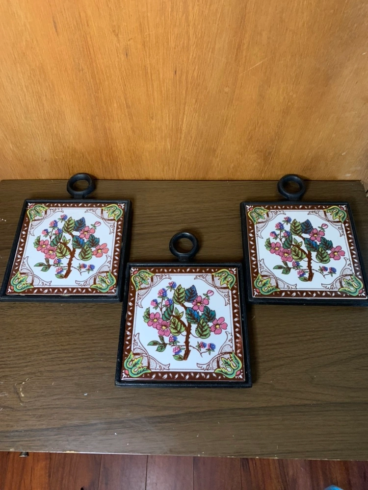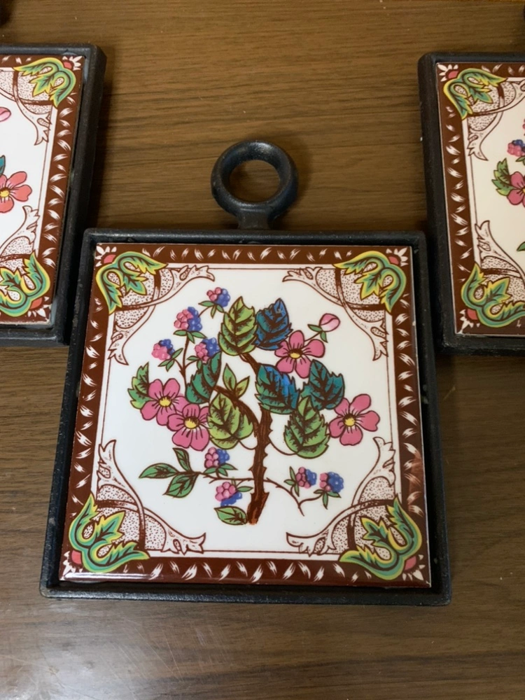 Set of 3 vintage tile trivets with floral design and cast iron frames