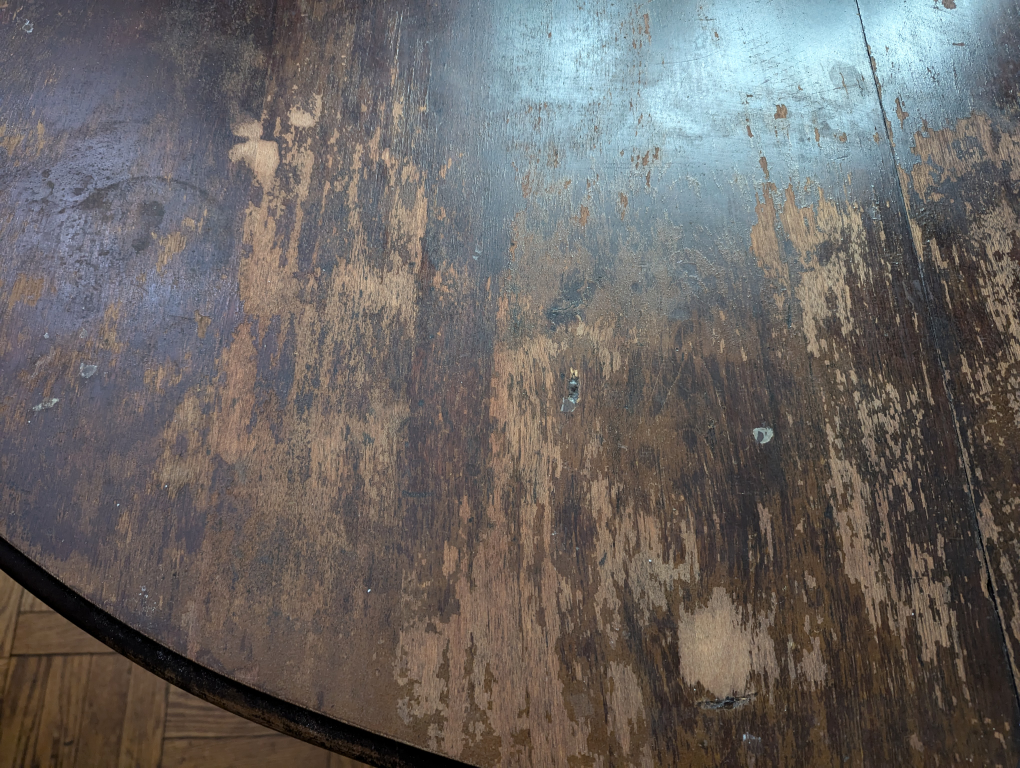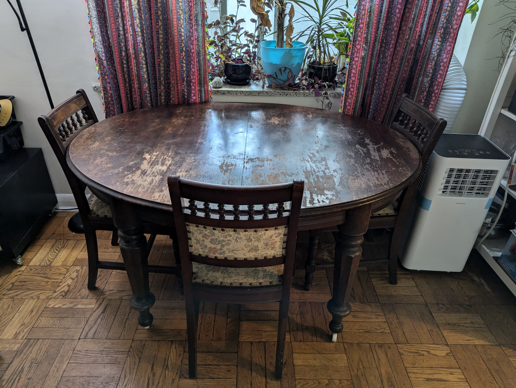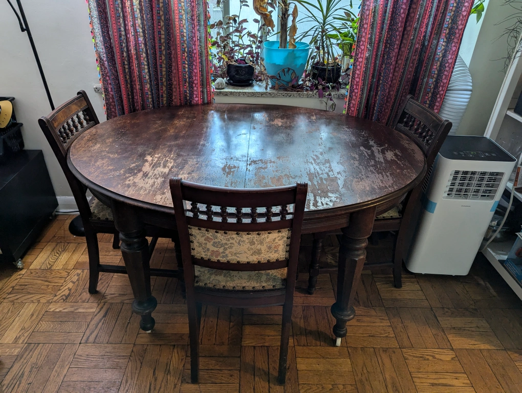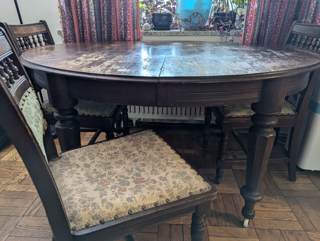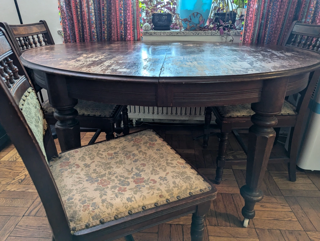 Solid wood table with four matching chairs. The chairs are upholstered with a floral pattern. Excellent vintage condition.The surface needs sanding, polishing and a new coating. Perfect for furniture restoration project.