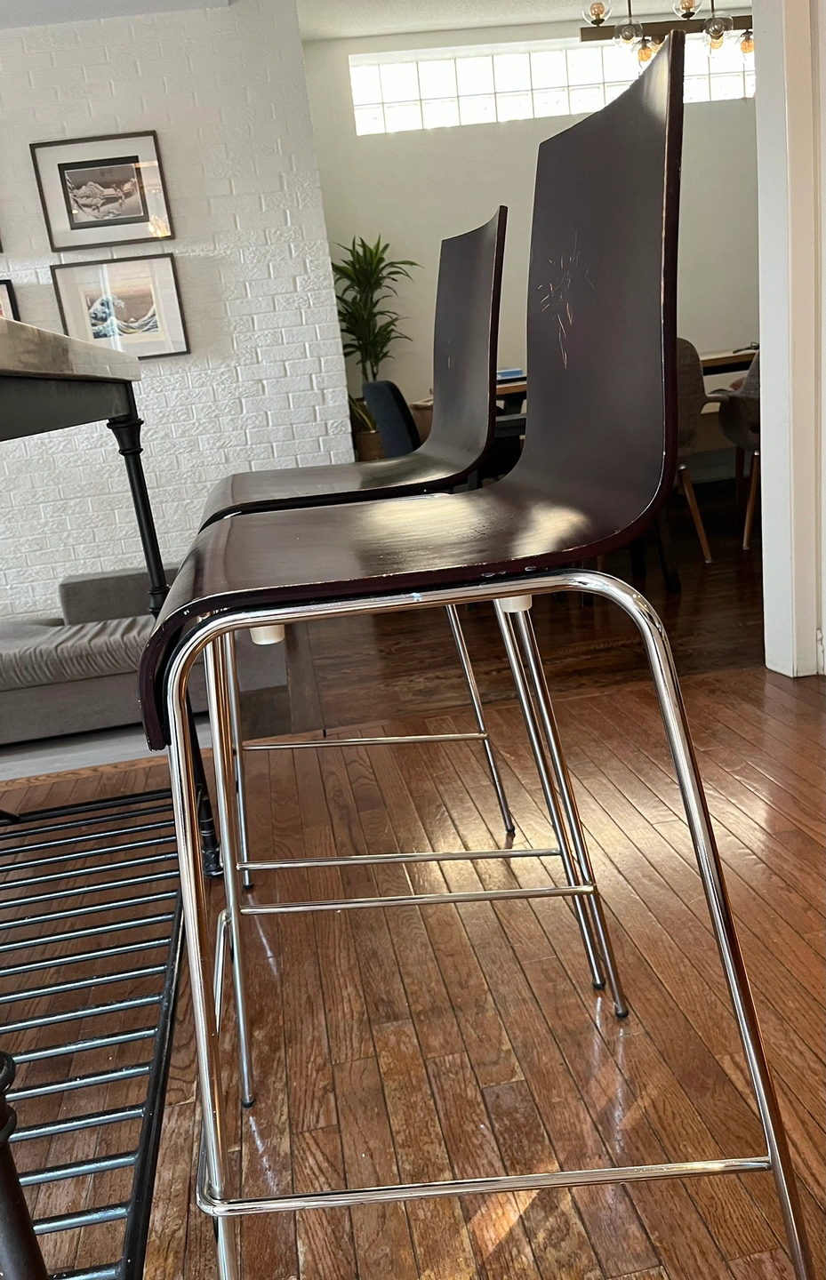 Pair of bar stools, dark wood seat and chrome legs. Solid and stable. Some scratches on the wood can be re-stained. Selling as is.