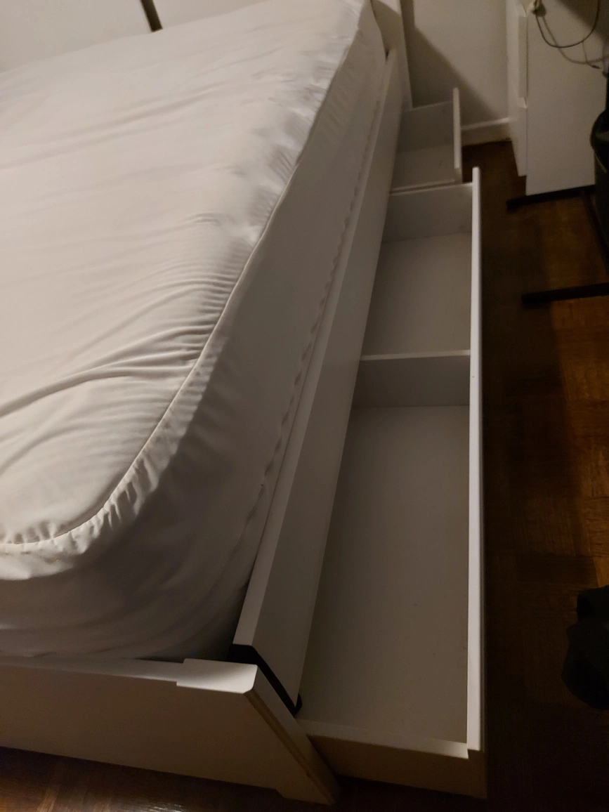 Queen size, bed frame in white with four built-in drawers. 2 on each side of bed.