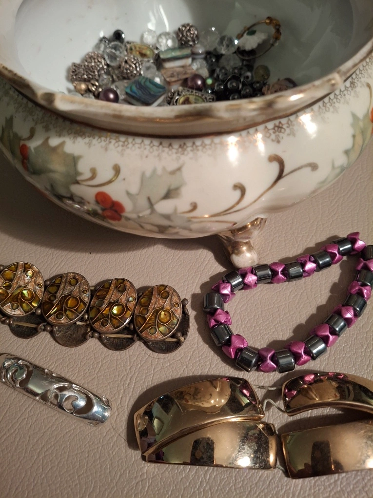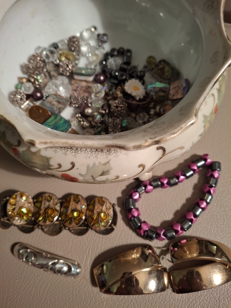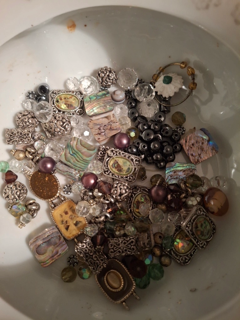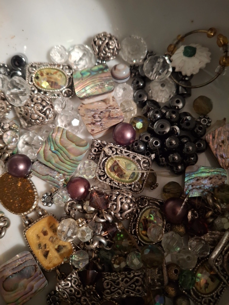 Bag of broken jewellery- ready for a creative person to make something beautiful! Great for crafters. Assorted pieces that can be repurposed + 4 bracelets that need to be restrung. Available for pickup in Markland Wood.