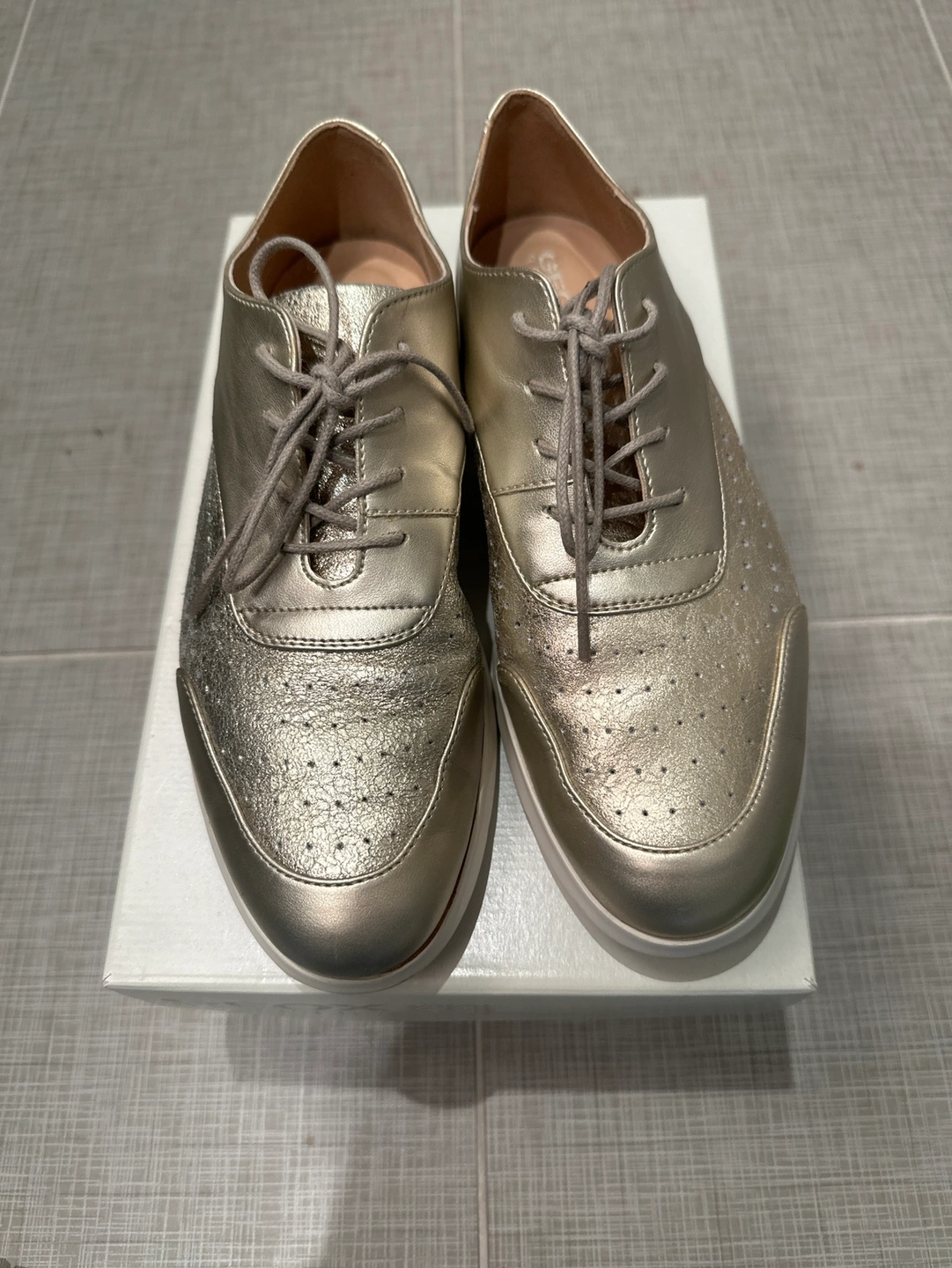 These leather women's shoes are in a gold colour with a white sole. They are lace-up shoes and have the Geox breathable technology.