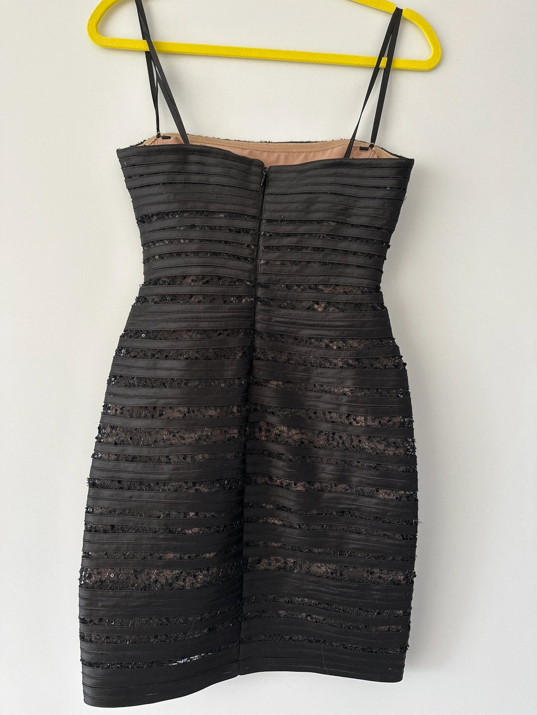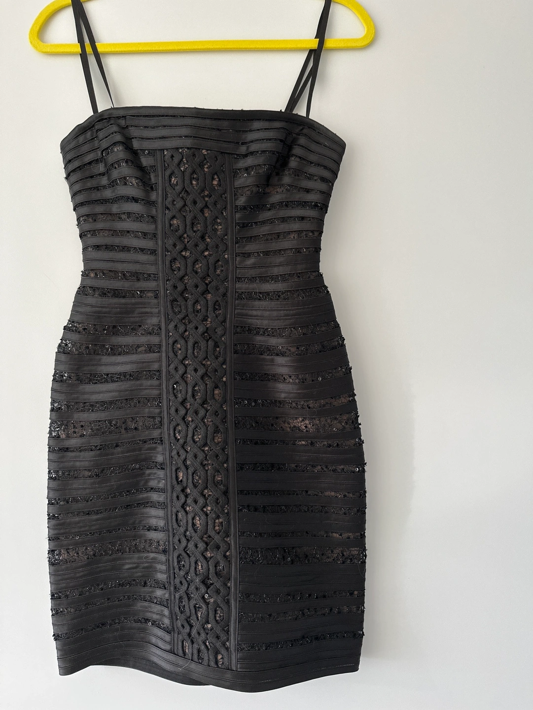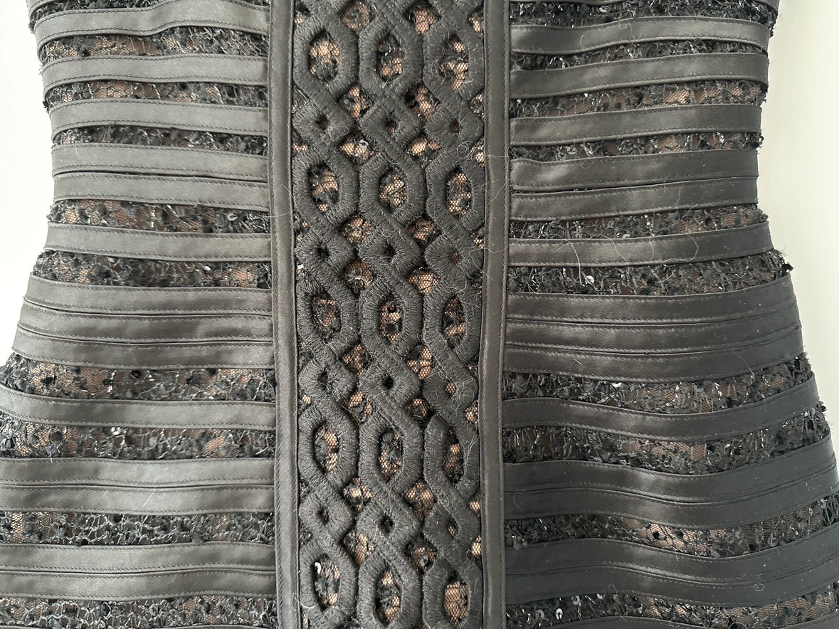 Beautiful black cocktail dress with a fitted bodice and a slightly flared skirt. It is made from a luxurious fabric with intricate details. Perfect for a night out or a special occasion. Worn once for a wedding