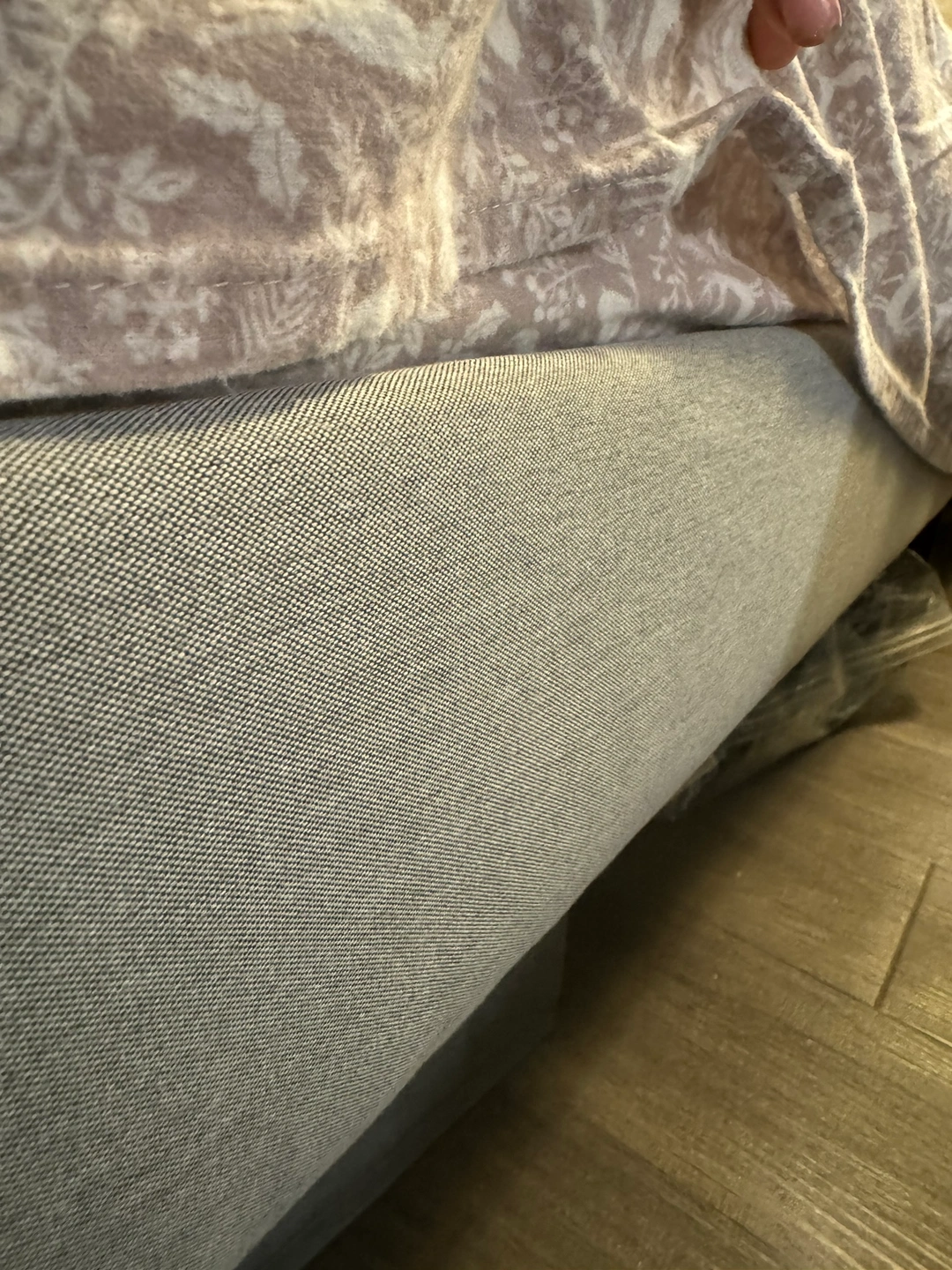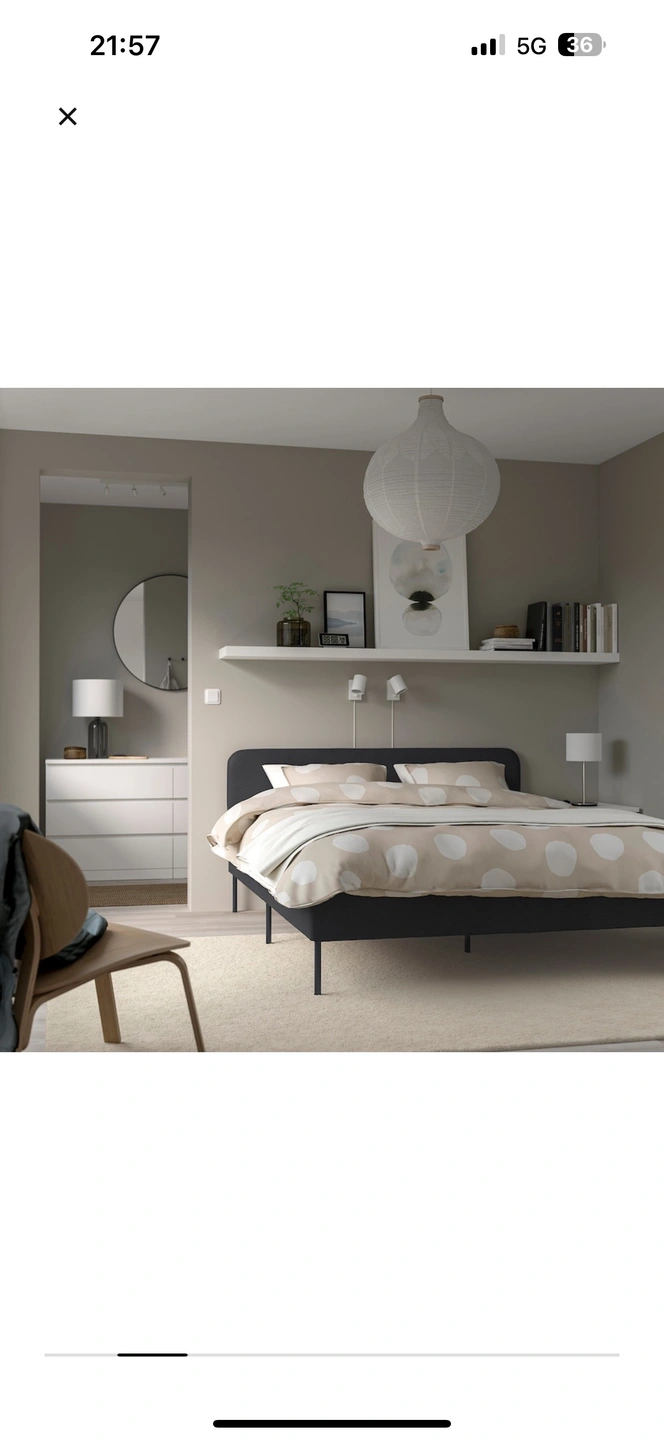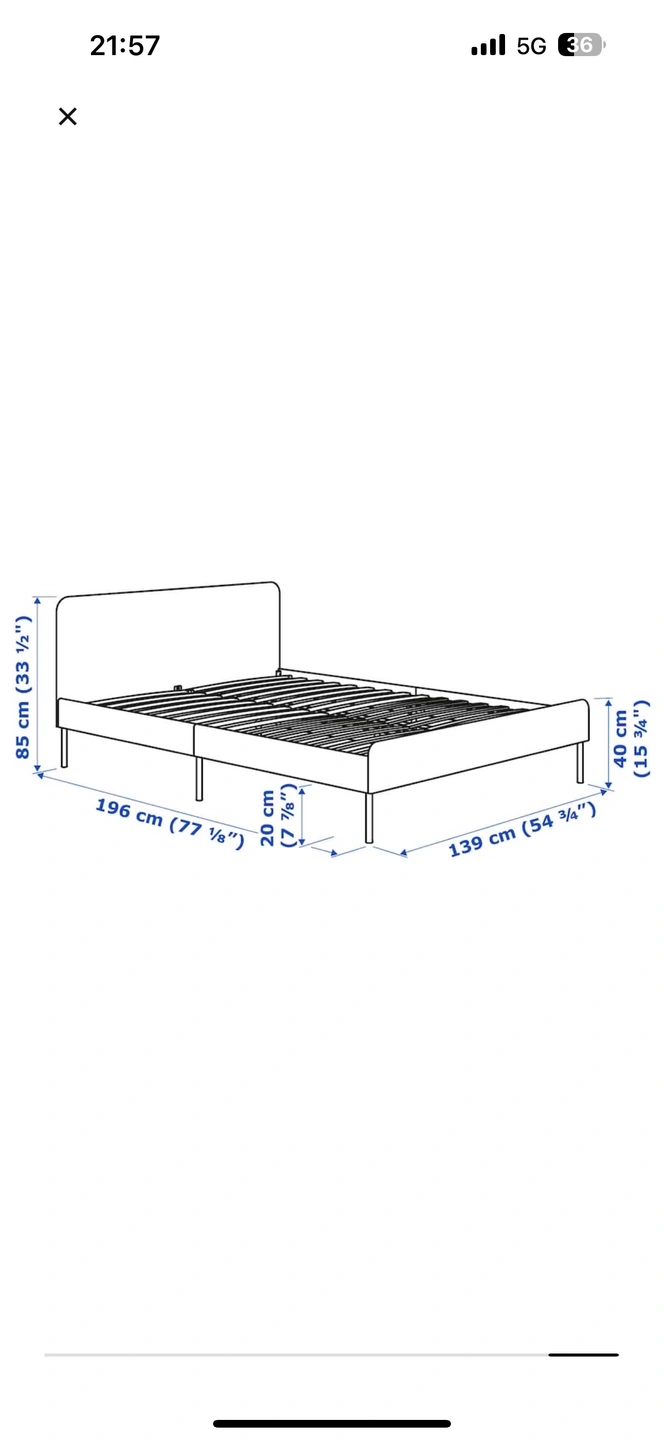 Light gray bed frame with a headboard and footboard. Includes slats. Does not include a mattress. This colour is no longer available at Ikea. Bought it 18 months ago but barely used it.