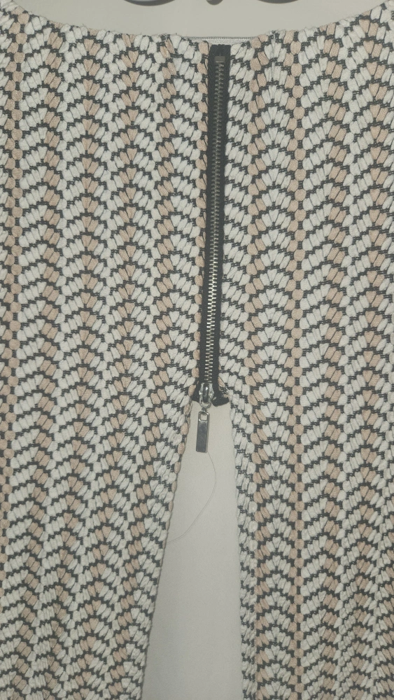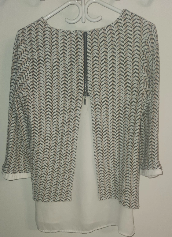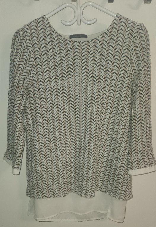 This is a long-sleeved white blouse with a brown geometric pattern. It has a zipper up the back. The blouse has a white undershirt.