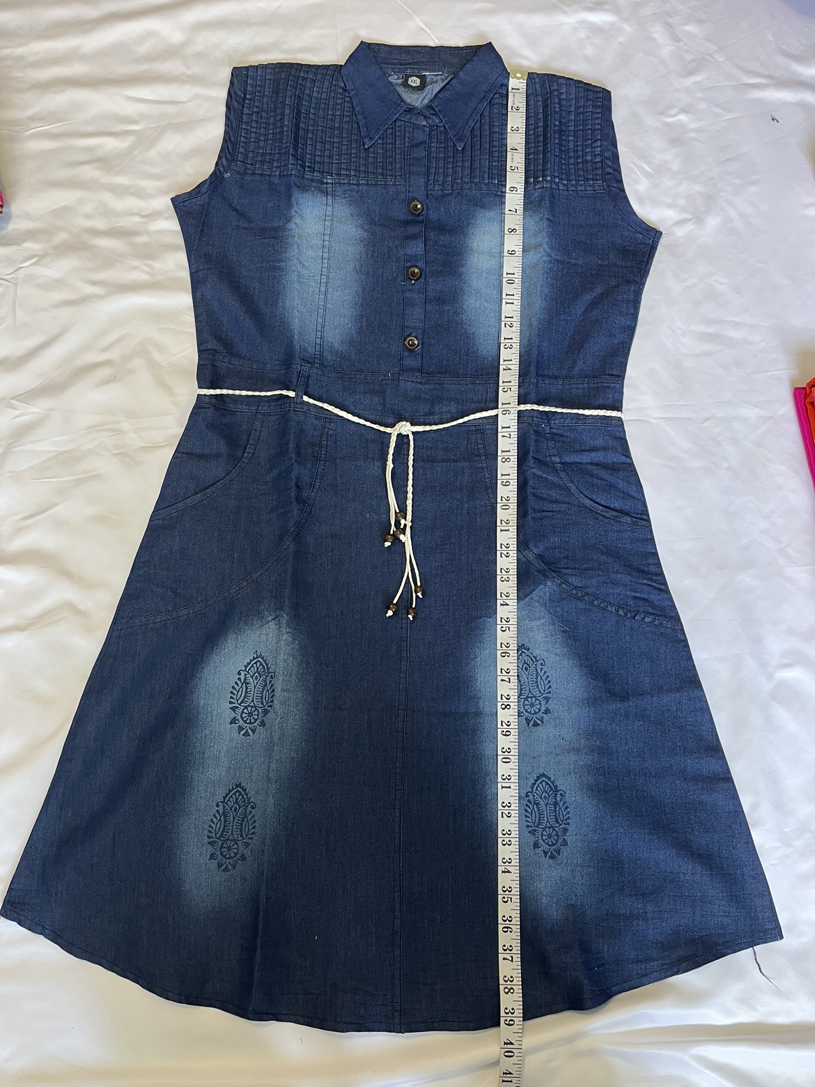 A sleeveless blue denim dress with a white belt. It features a collared neckline and a button closure.
