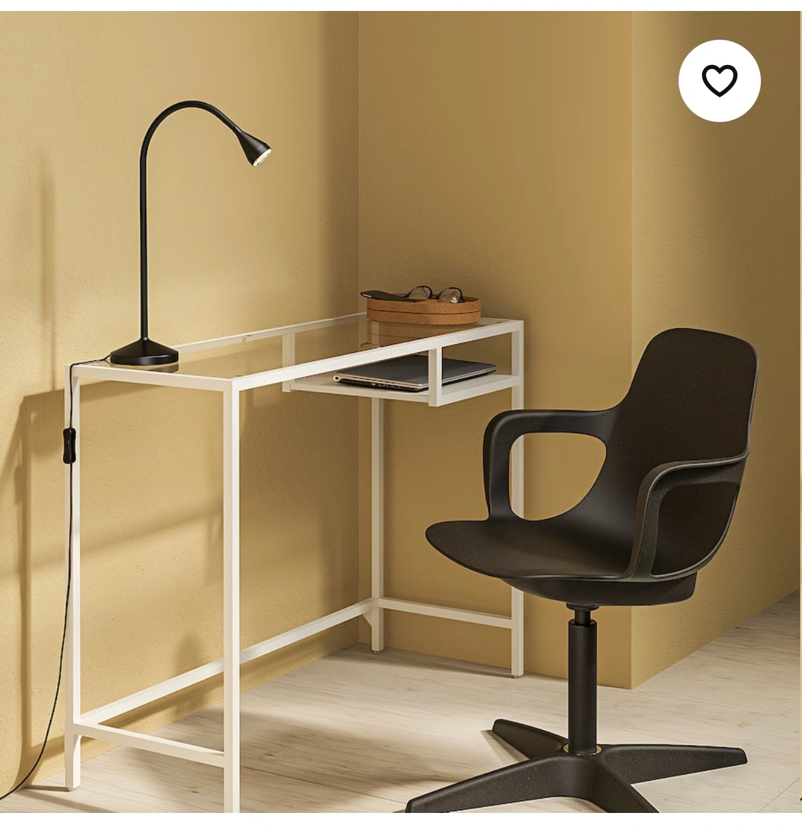 The stylish and slim VITTSJÖ laptop table in metal and tempered glass has clean lines and is an easy-to-place piece of furniture. With the open and airy design, you enjoy a good and discreet work surface.