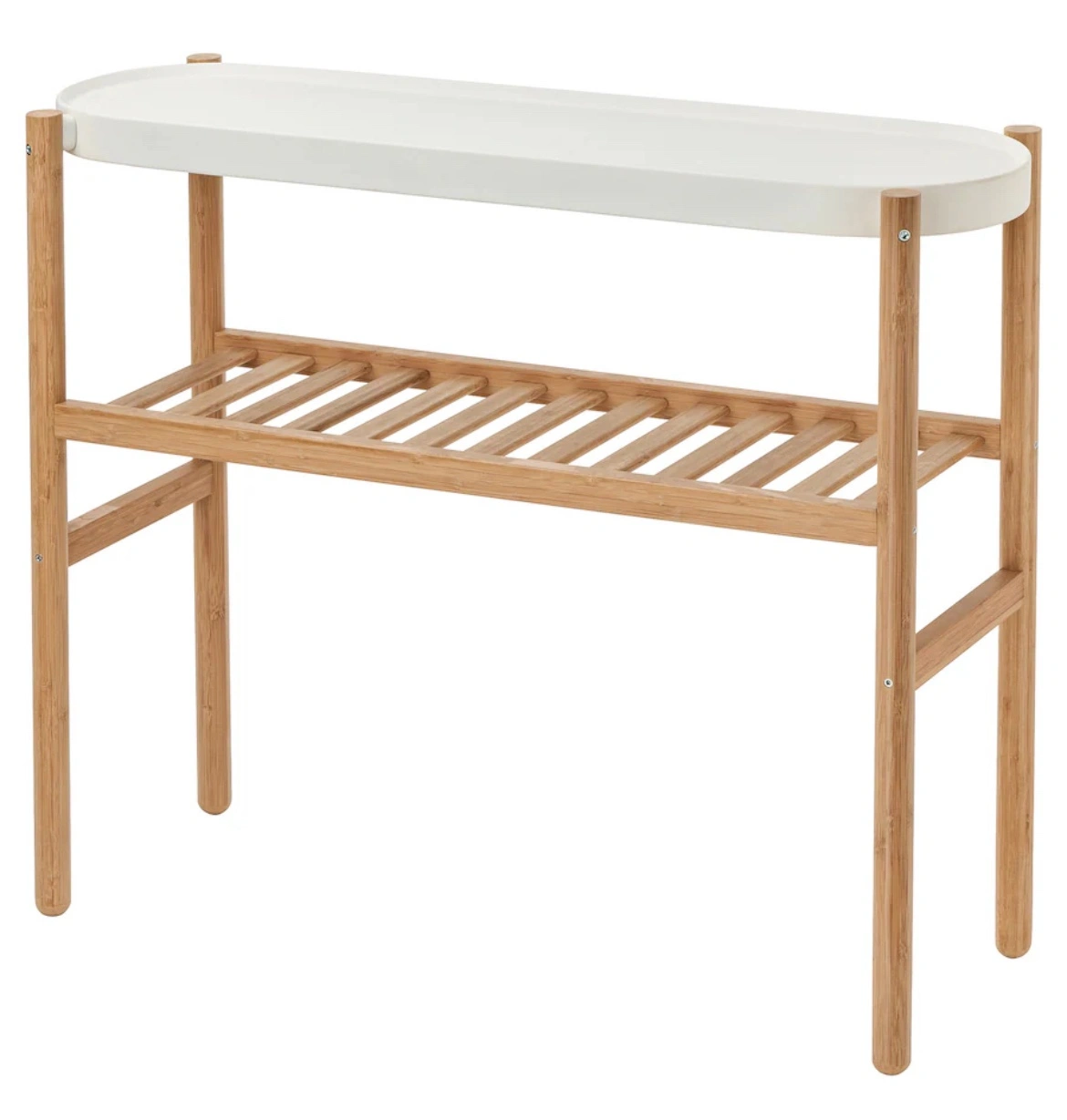 Two-tiered plant stand with a white top shelf and slatted lower shelf. It is made of bamboo and is in good condition.