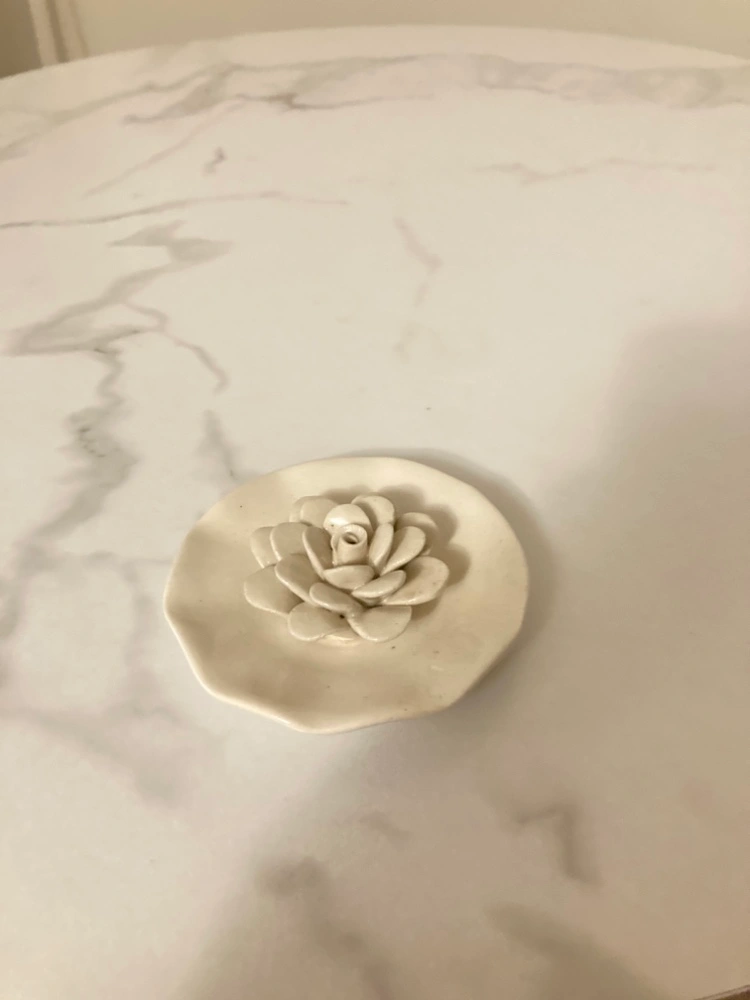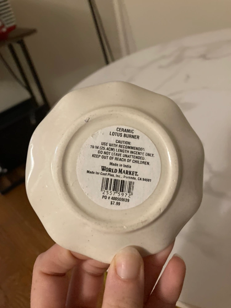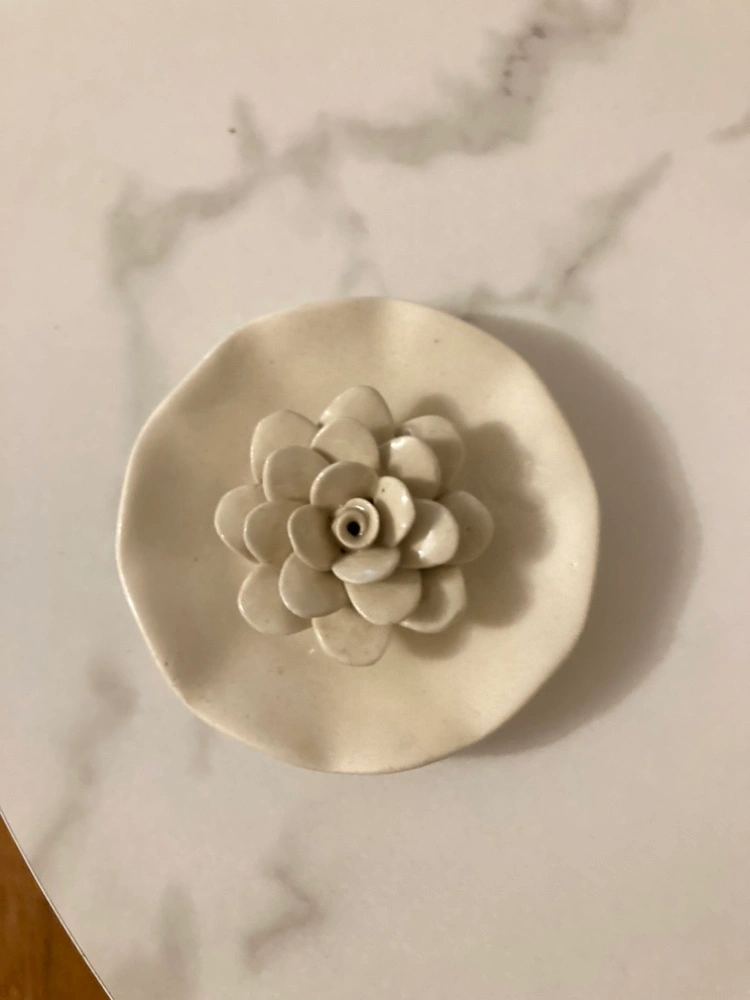 White ceramic lotus incense burner. It features a small hole in the center of the lotus flower to burn incense. It comes with a plate that catches ashes. From World Market and approx. 4 inches large!