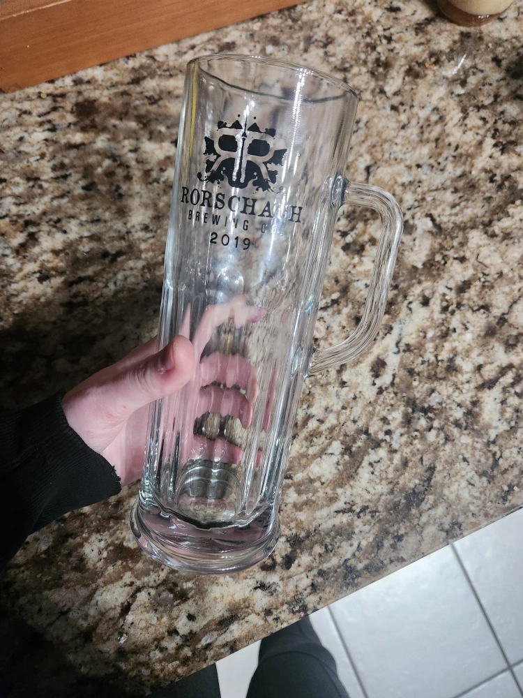 Tall clear glass beer mug with Rorschach older Brewing logo. Heavy & Tall.