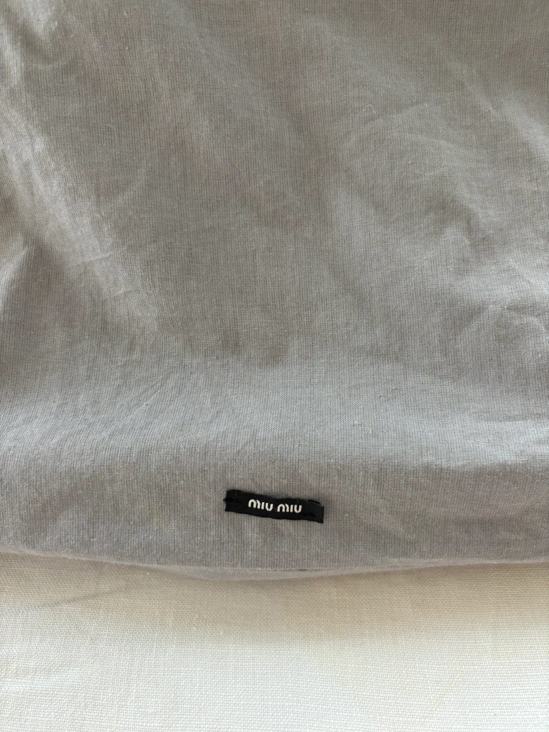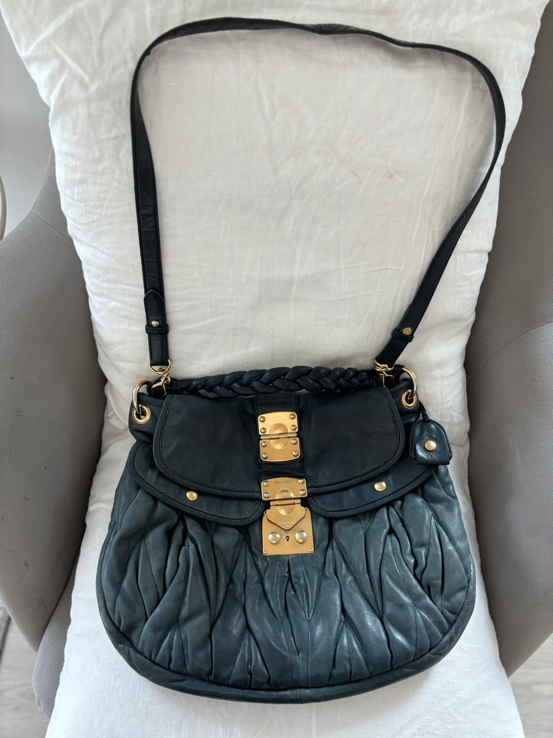 A beautiful steel blue lambskin leather authentic Miu Miu Coffer Matelasse bag with gold hardware. It has a braided leather top handle and a detachable shoulder strap. The bag features a signature quilted design and a push-lock closure. Very good pre-owned condition with natural signs of wear. No rips,stains or odours. Comes with dust bag.