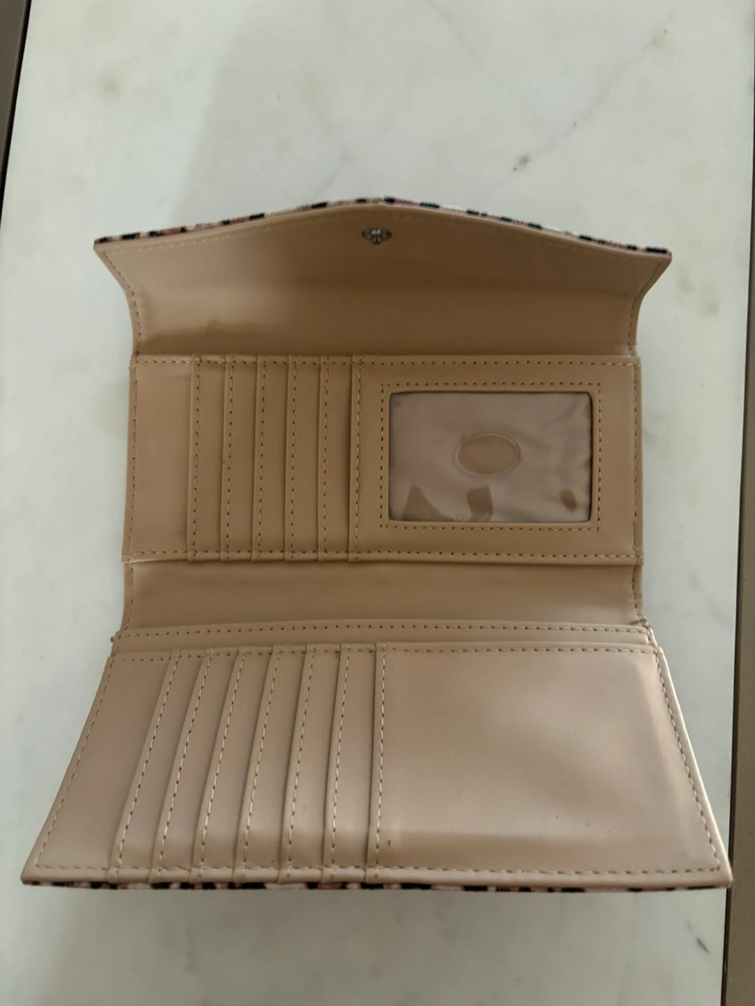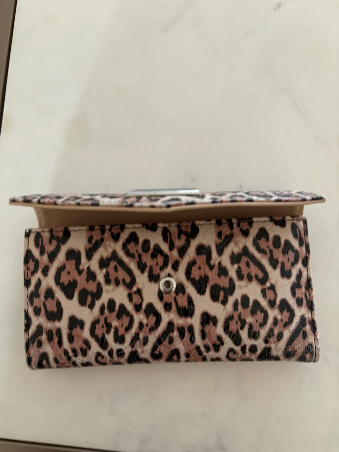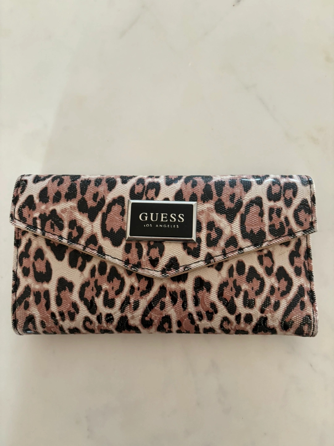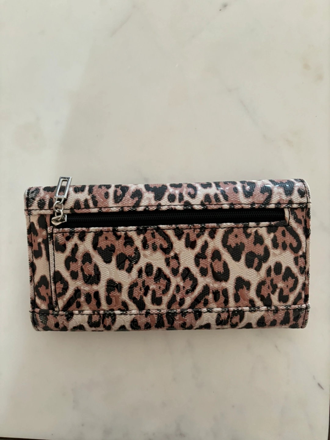 This is a Guess wallet with a leopard print design. The wallet is brown and black with a silver Guess logo. It is made of a synthetic material. The wallet has a snap closure and a zippered pocket on the back. It has multiple slots for credit cards and an ID window.