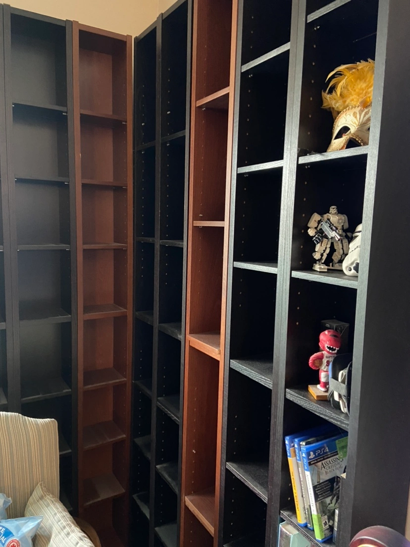 Ikea bookcases, 6 black and 2 brown. They are each 71 inches tall and 11 inches wide. They have five shelves each, perfect for displaying books, collectibles, or home decor. They can be arranged in a variety of configurations to fit your space.