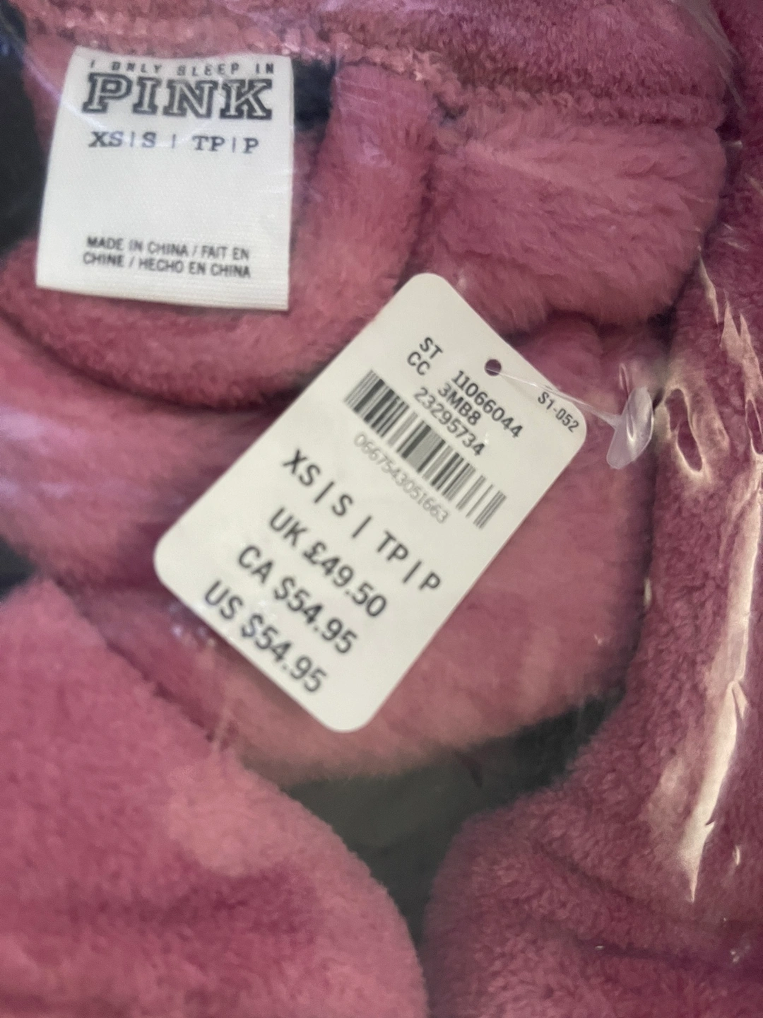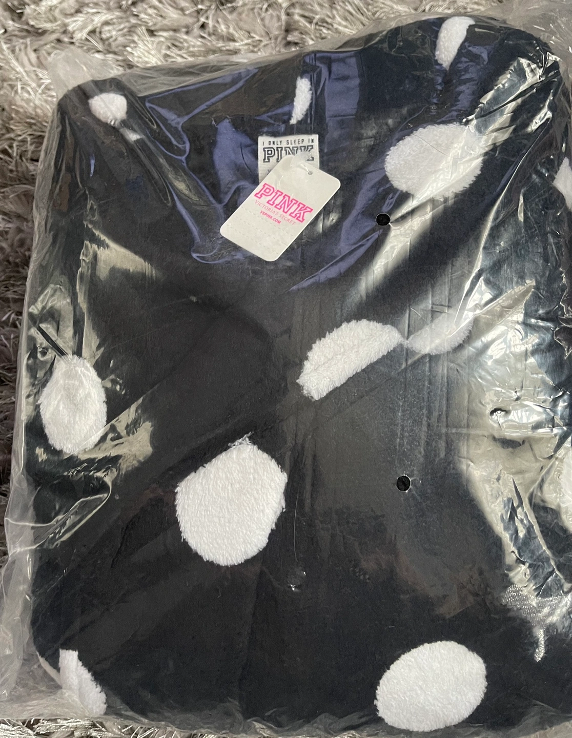 New with tags, size XS. Soft and cozy. Perfect for a night in! The robe is pink with black polka dots. It has a matching belt and a comfortable collar. The fabric is soft and warm. It is machine washable. Would make a great gift!