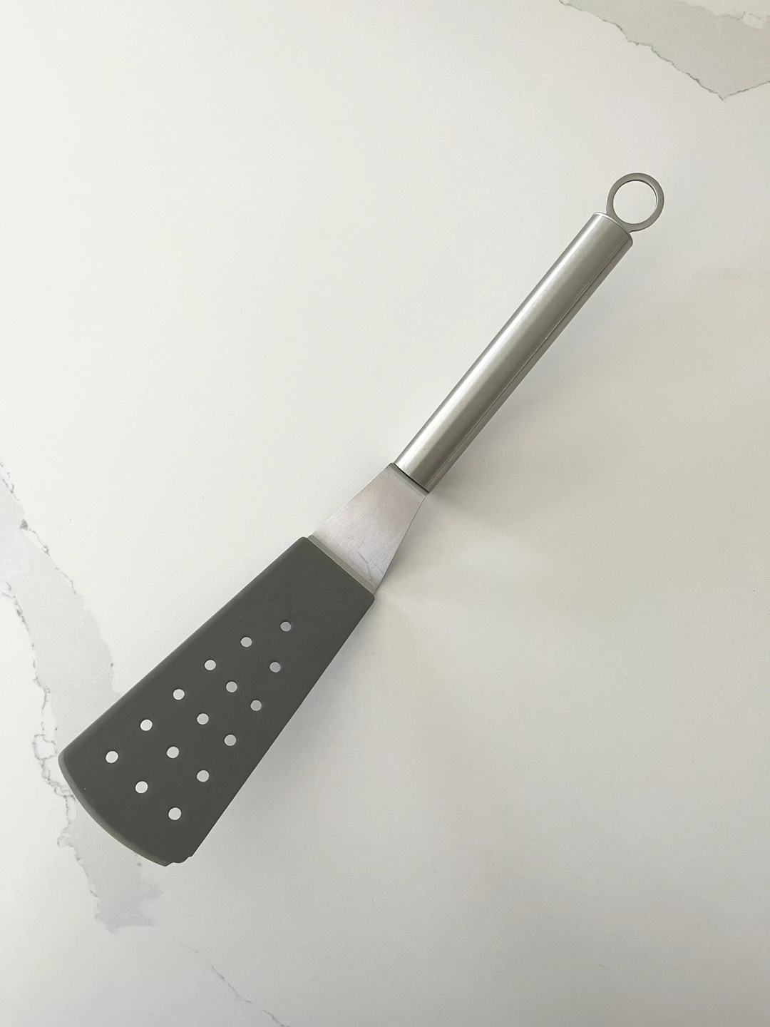 This is a grey spatula with a stainless steel handle. It has a hole in the handle for hanging. The spatula has a slotted design to help drain liquid from food. Trying to get rid of duplicate cookware.