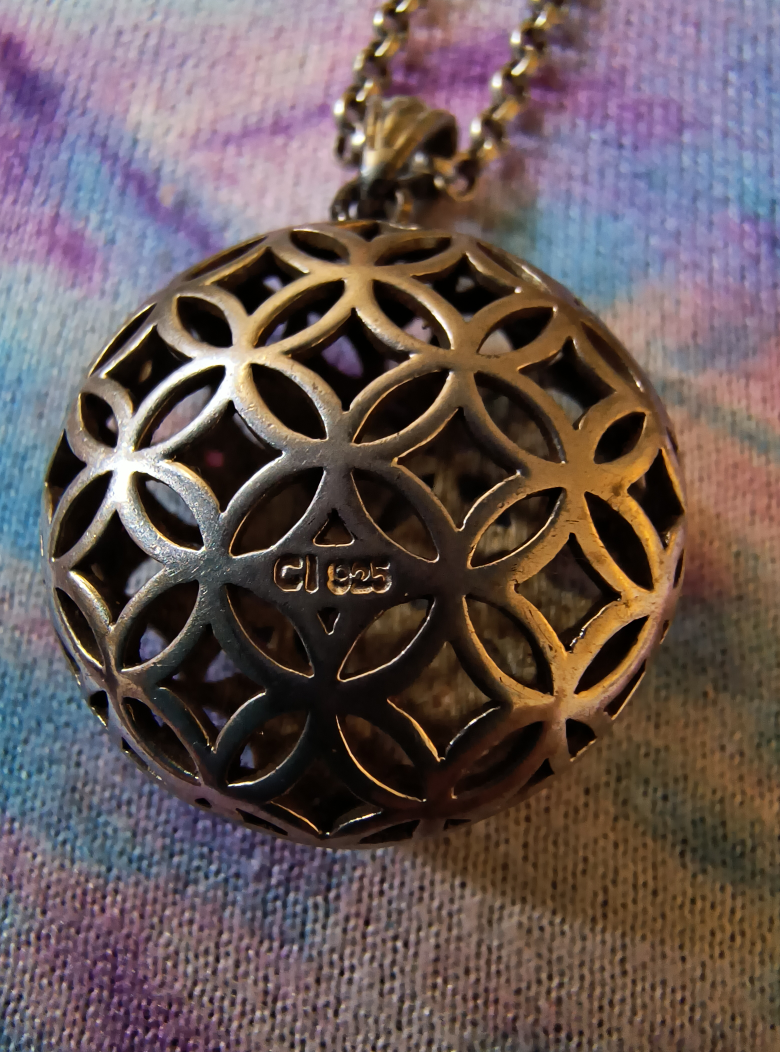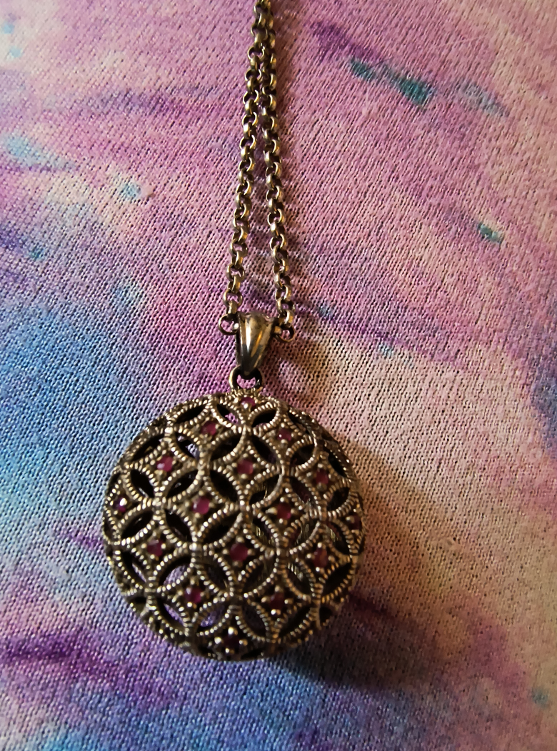 this necklace is 925 platinum plated, with 925 silver. the pendant has several small rubies in it.