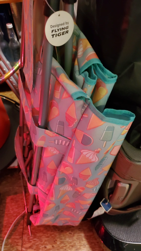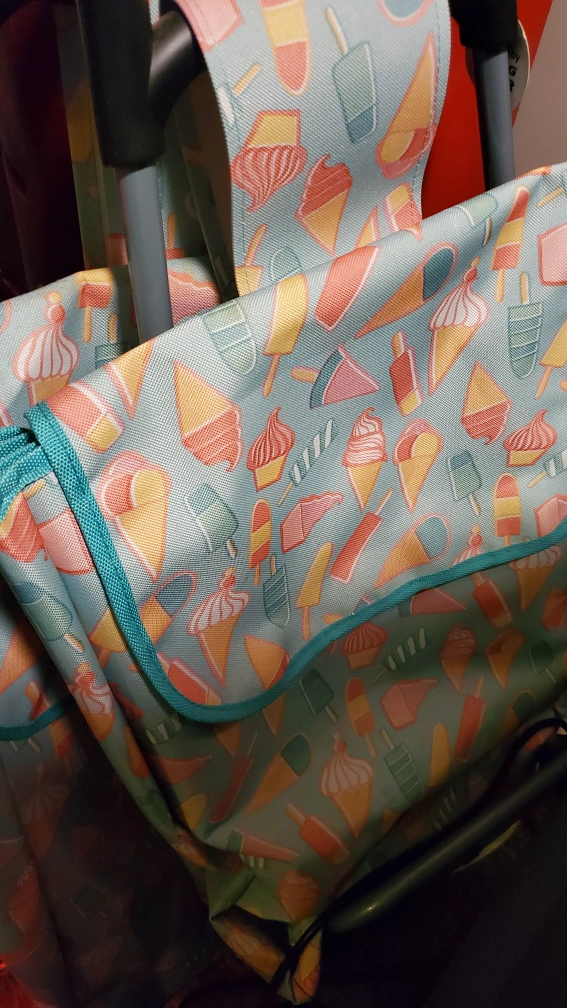 This is a collapsible, folding shopping cart. It has a blue and yellow ice cream themed design. It features a fabric bag and metal frame. It collapses down for storage and is great for grocery shopping, errands, or just carrying items around.