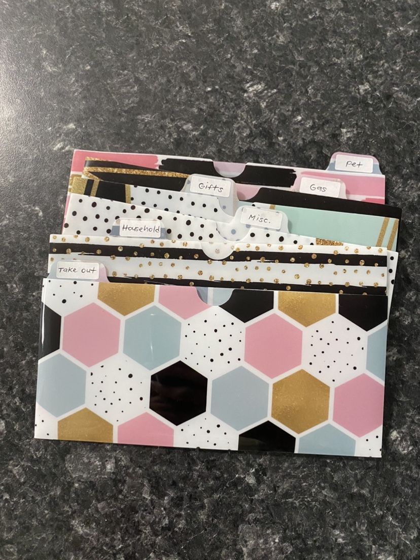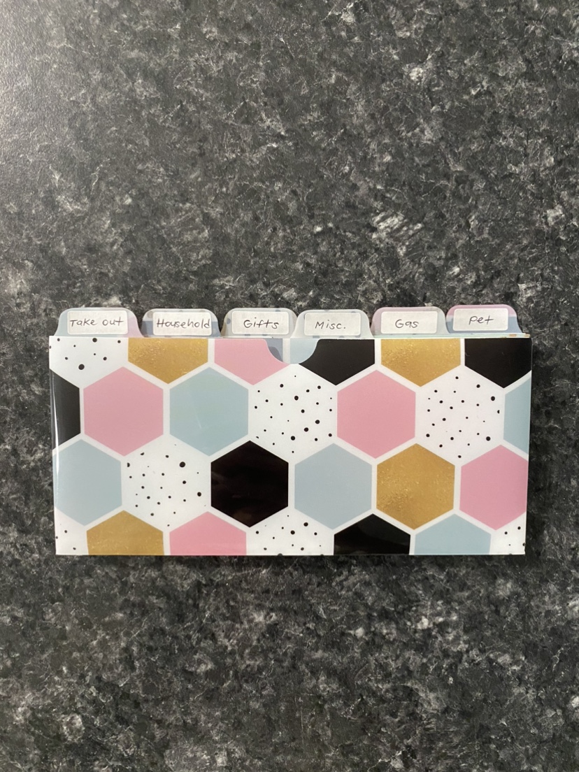 Cash envelopes with tabbed dividers labelled "Take Out", "Household", "Gifts", "Misc.", "Gas", and "Pet". These envelopes fit perfectly in a standard wallet.