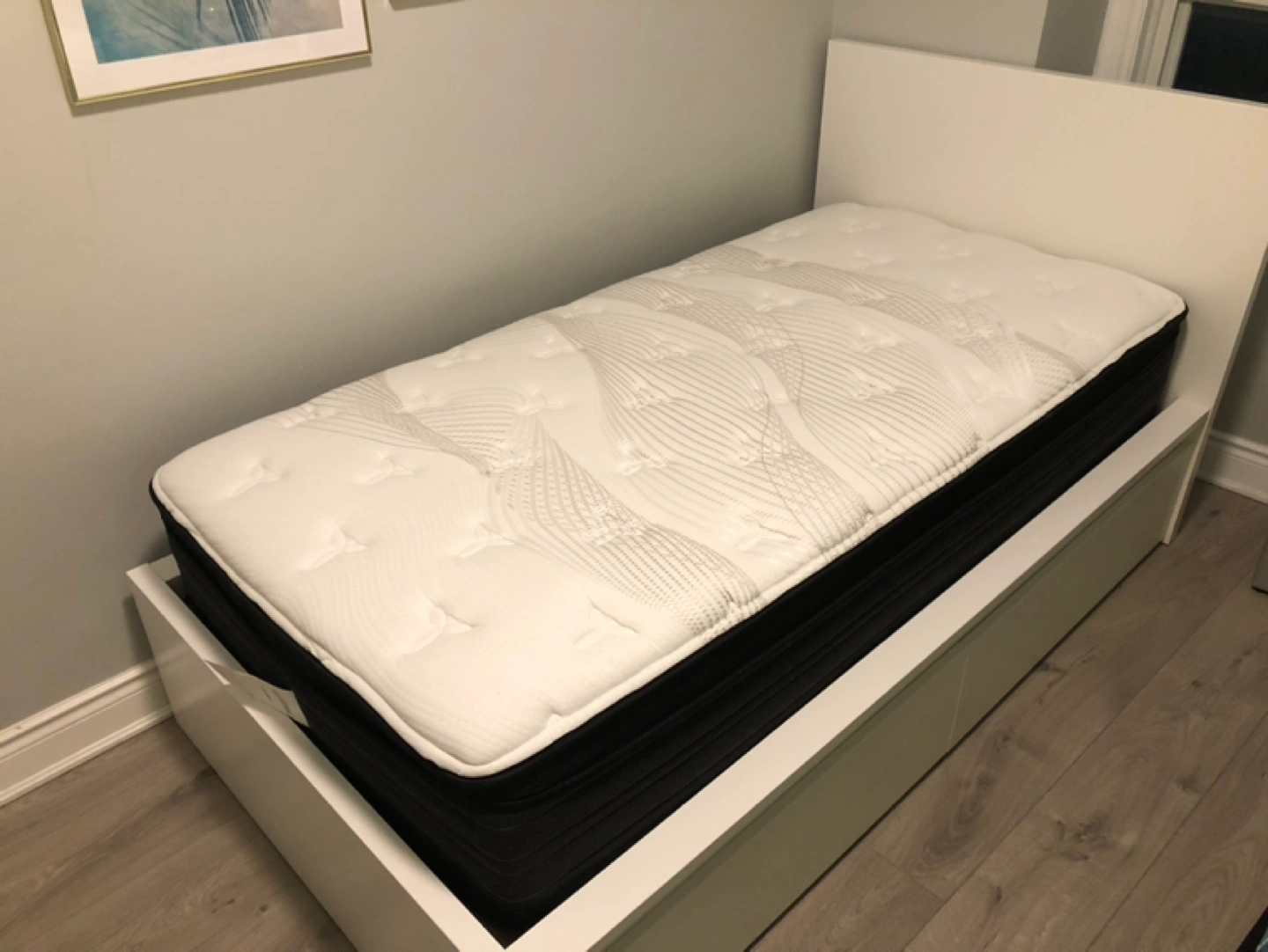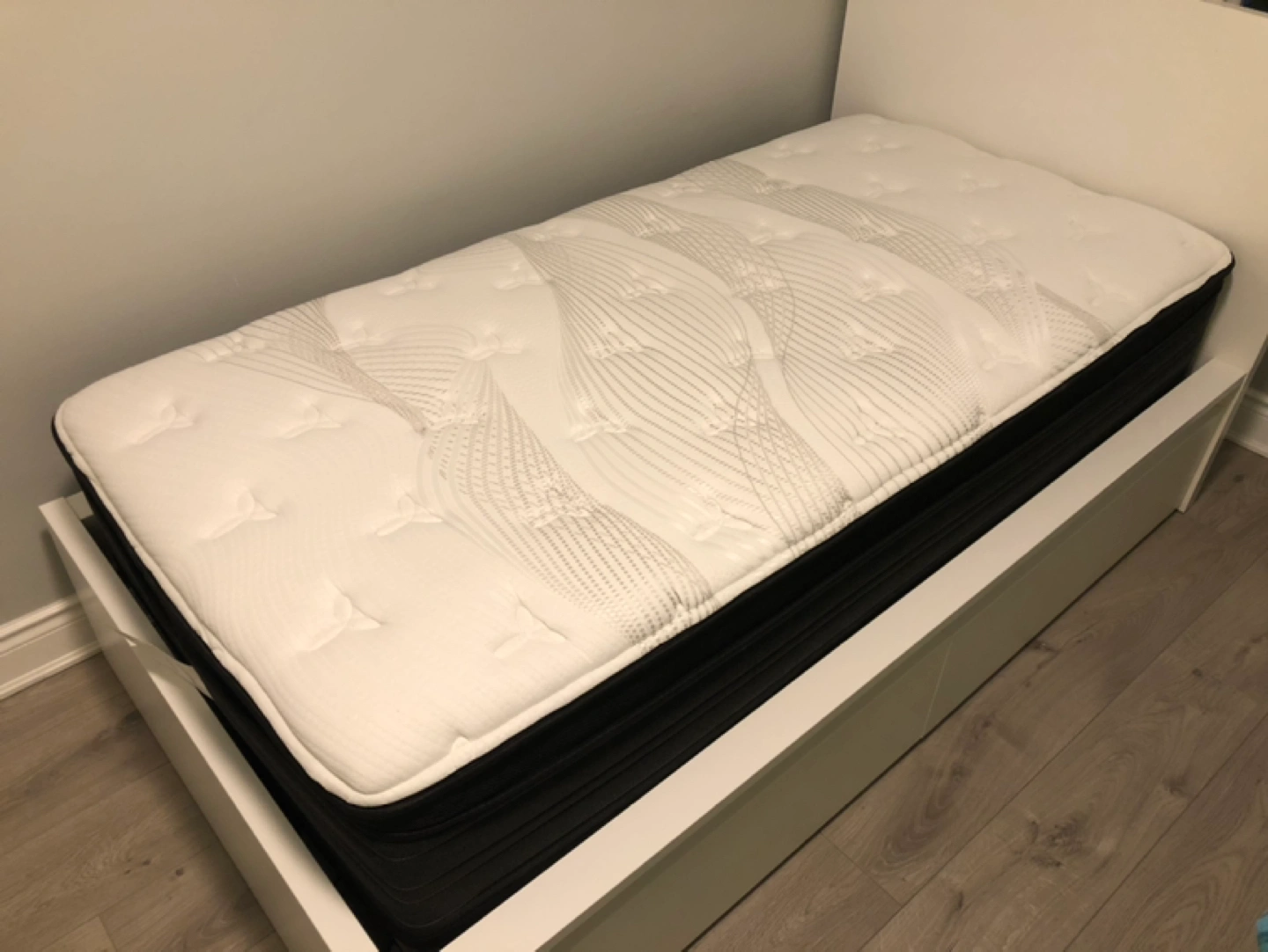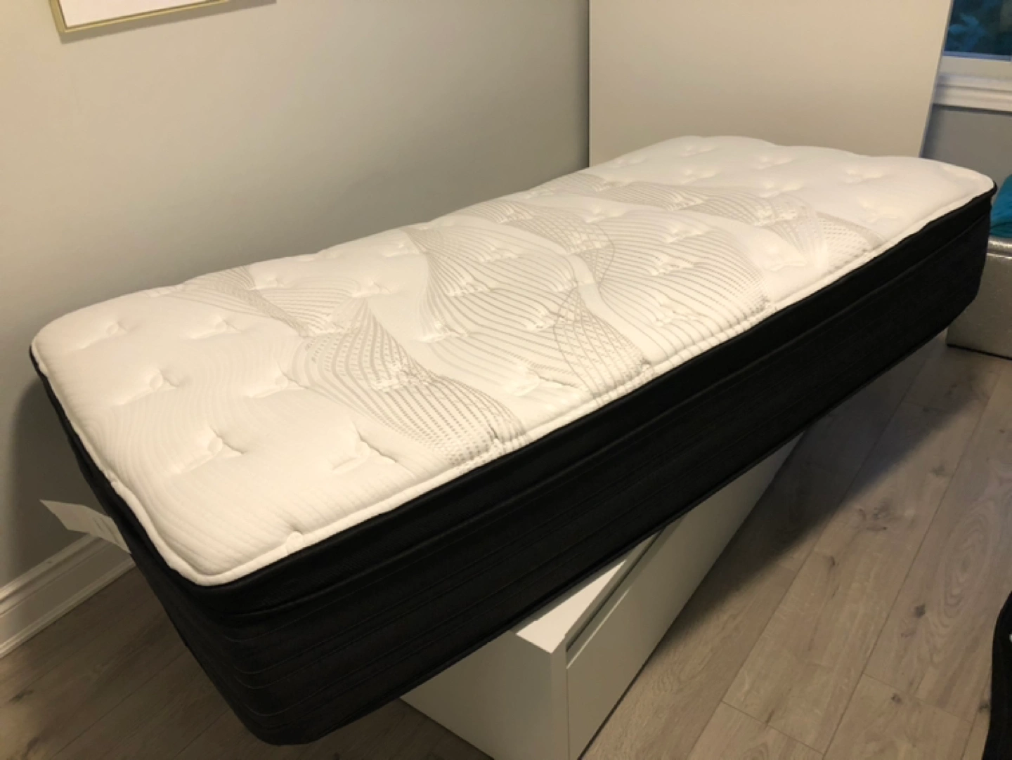 High End Simmons Beauty Rest Twin Mattress. Model: Ultra Groveland CT / Cushion Top. Always doubly protected with extra foam topper and bamboo health guard mattress protector. Like new, 2 years old, very clean home. Bought from Leon’s for $950 taxes included (screenshot attached). Moving abroad and no longer need / have no place to store. Nice, plush, comfy clean mattress looking for new home.