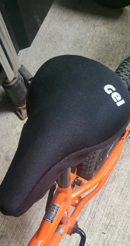 Orange kids bike with a black seat and black wheels. The bike is in good condition. It has a kickstand and a bell. The bike is a 12-inch bike.