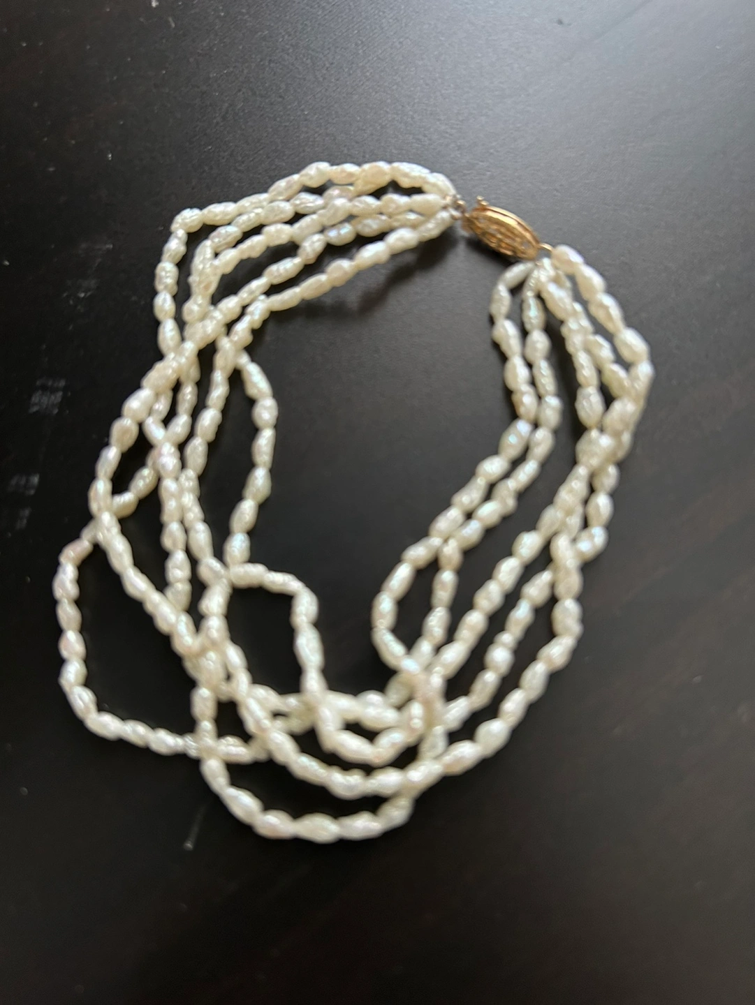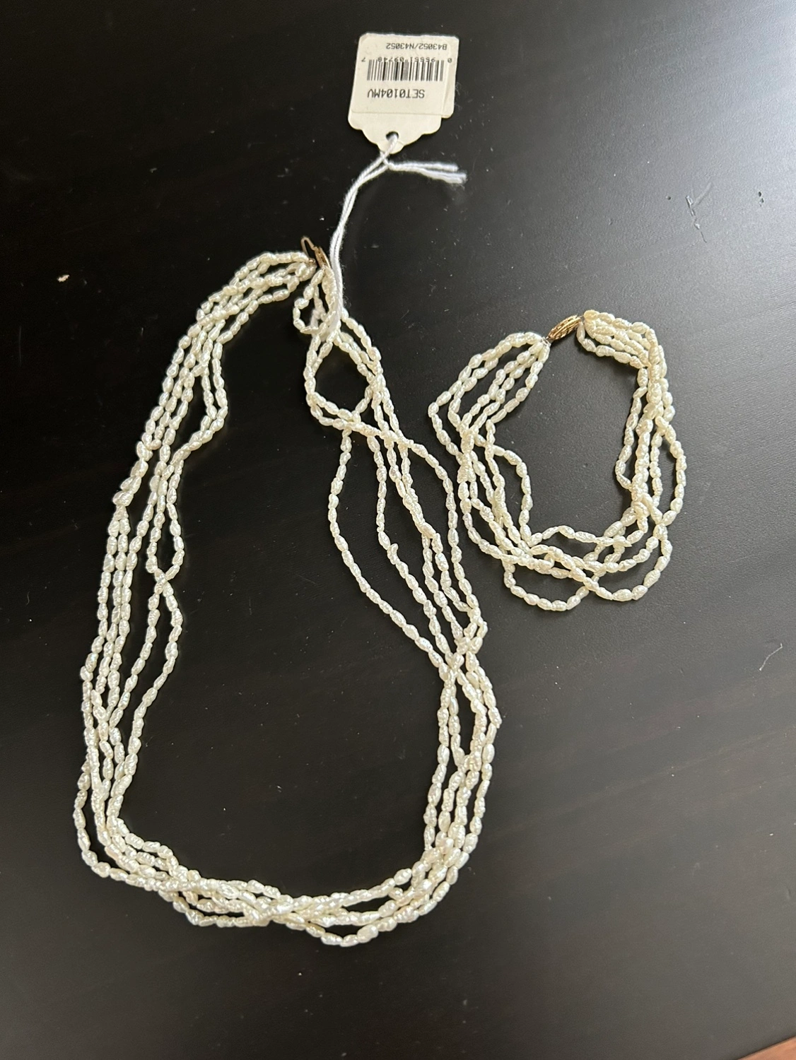 A set of pearl necklaces and bracelet in excellent condition. The necklaces are in a multi-strand design and the bracelet is a single strand. Both have a gold clasp. Costume jewelry Asking$8.00 for both