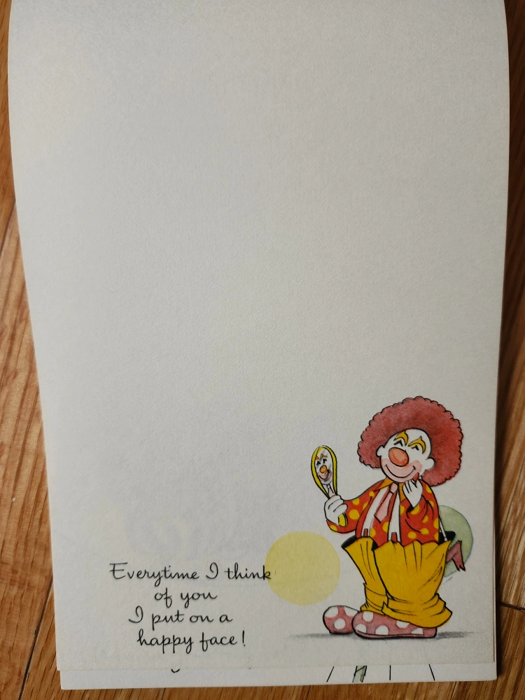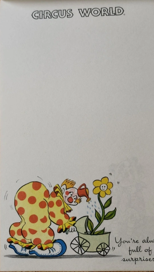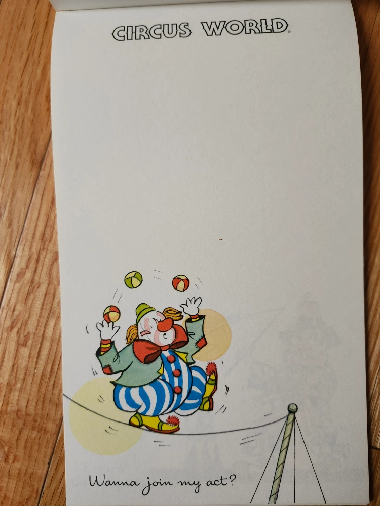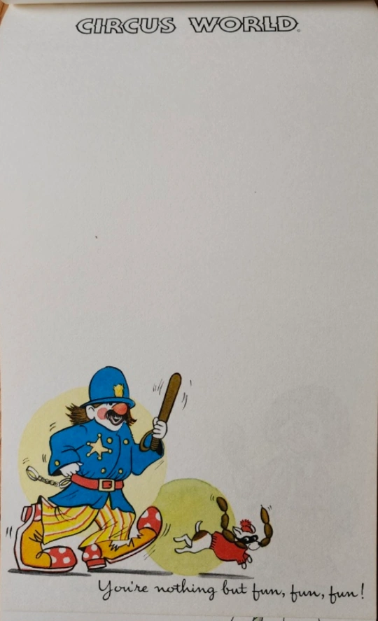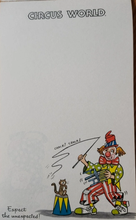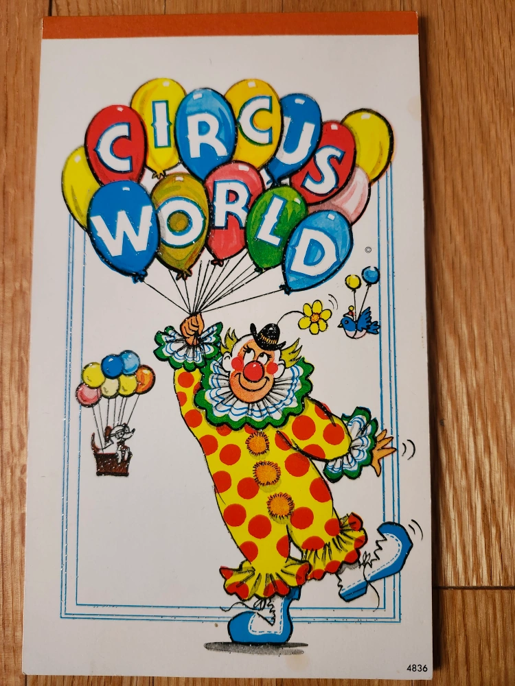 Vintage Circus World notepad with clown illustrations.