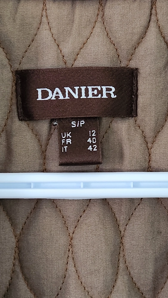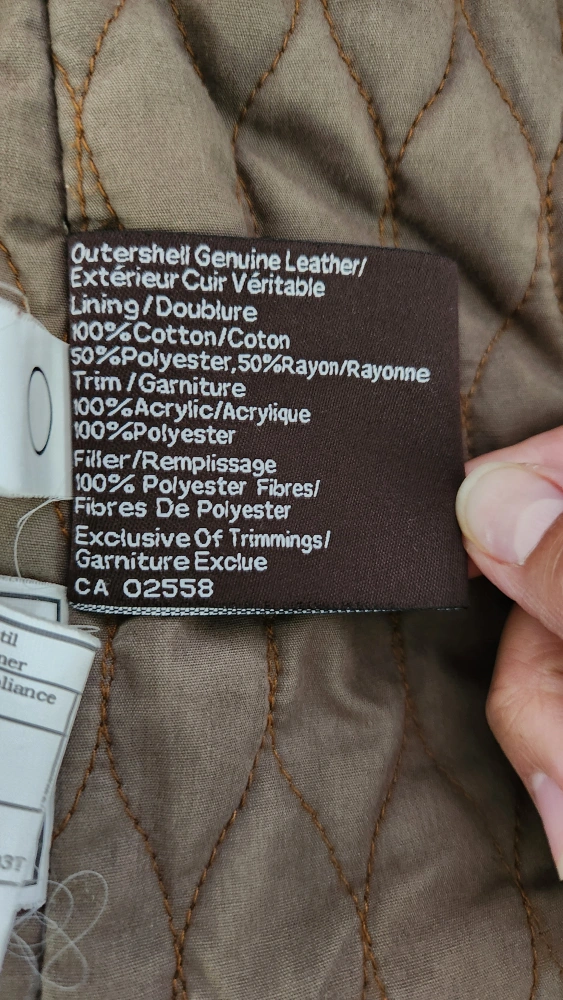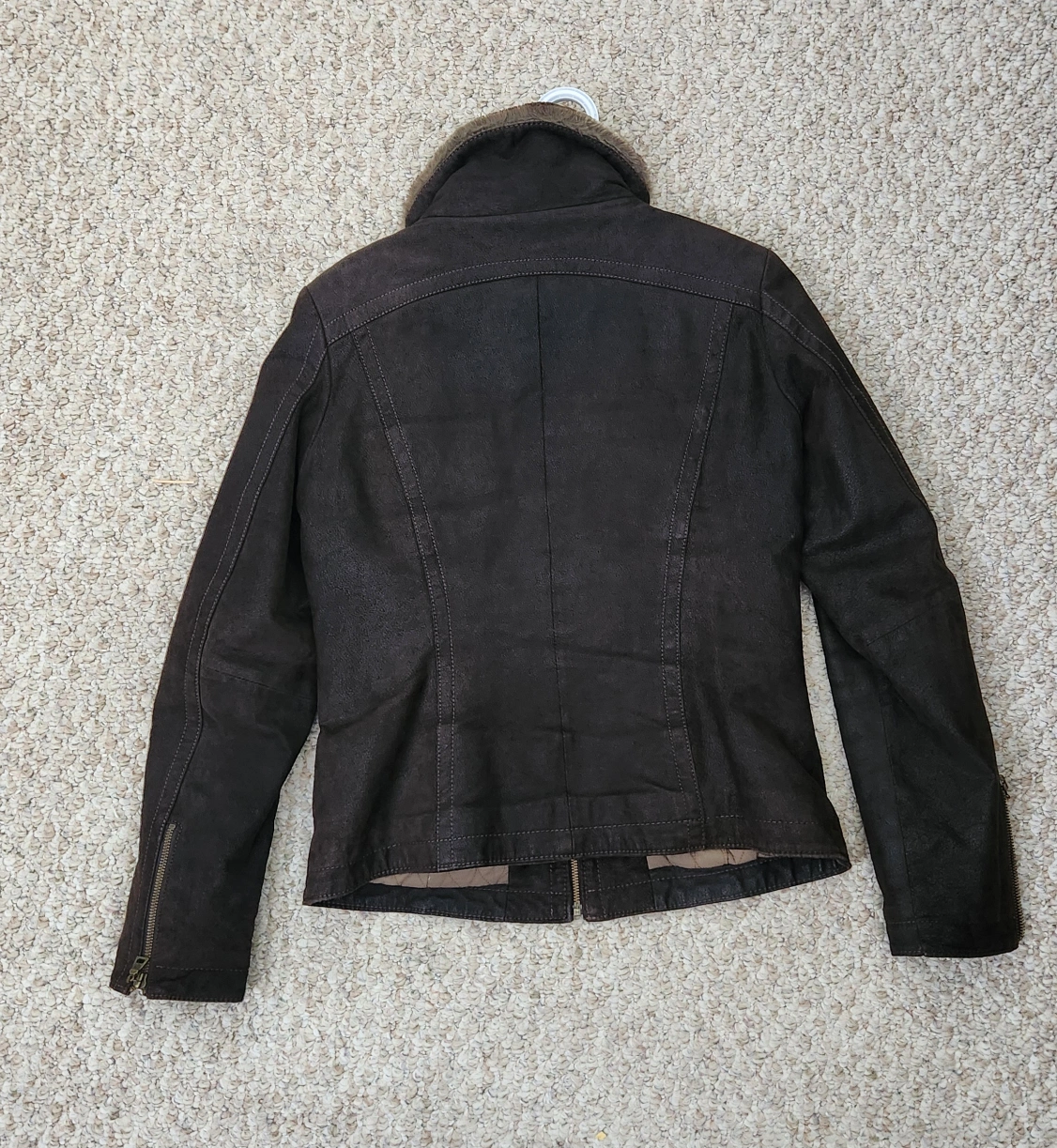 A brown leather jacket with a faux fur collar. It has a zipper closure and two button pockets. The jacket is in good condition.